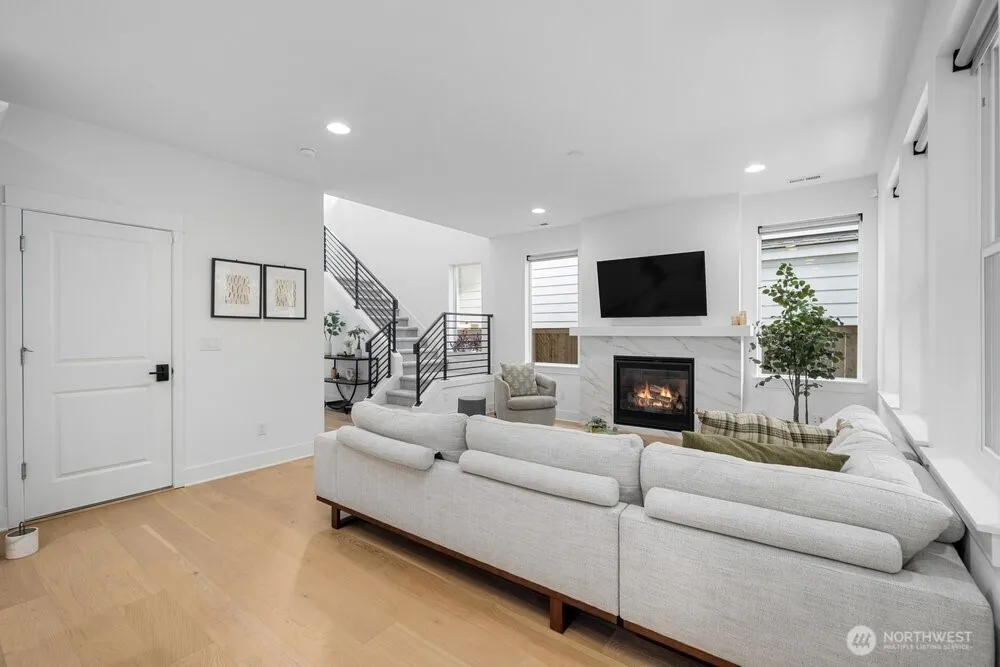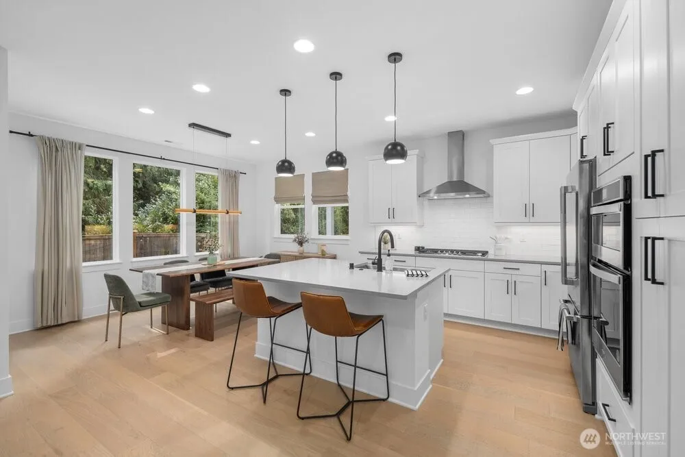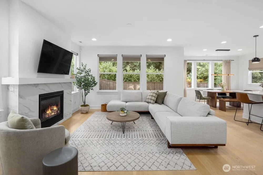 Nestled in Meadowdale, this turnkey 5-bed modern home showcases light-filled interiors with wide-plank oak hardwoods and a thoughtfully designed open-concept layout. A cozy gas fireplace anchors the main living area. Chef-inspired kitchen features a built-in 4-burner gas range with hood, stainless steel appliances, subway tile backsplash, & crisp white shaker cabinetry. A large island with sink & seating offers the perfect gathering space, while the adjacent dining area opens to a covered patio, ideal for year-round entertaining. Fully-fenced & private backyard. Thoughtful details include stylish modern lighting & hardware, AC, & versatile bonus area off the landing. All beds are generously sized, including the spacious primary suite with a luxe 5-piece ensuite featuring dual sinks, oversized soaking tub, walk-in shower, & custom built-in closet storage. 2-car attached garage + driveway parking. Bright, open, & move-in ready. A short stroll to Meadowdale Beach Park & near I-5, Alderwood Mall, Paine Field, & Boeing.
