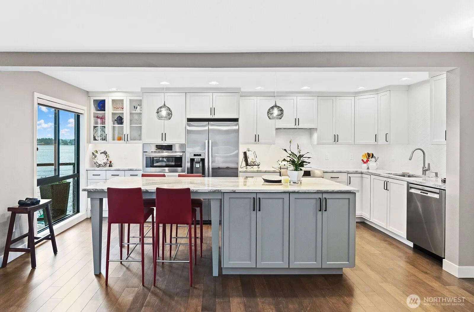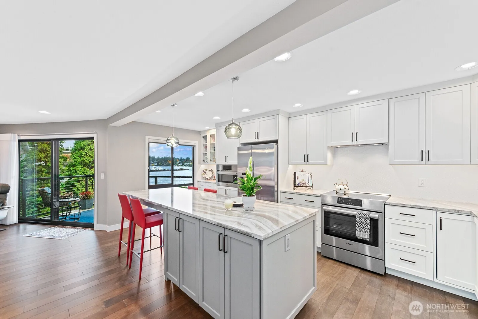 Welcome home to waterfront living on the shores of Lake Washington! Fully remodeled 2 bed, 2 bath Parkside Condo conveniently located adjacent to Carillon Point and a short walk into downtown Kirkland. Stylish remodel features high end cabinets, appliances, beautiful lighting and hardwood floors throughout. Enjoy water views from every room and step outside to a peaceful deck perfect for relaxation. Additional perks include spacious in unit laundry room, storage unit, and two designated parking spots. Enjoy private beach access and a dock with available boat moorage (kayak and paddleboard storage at beach). Secure building with ample guest parking and no rental cap.