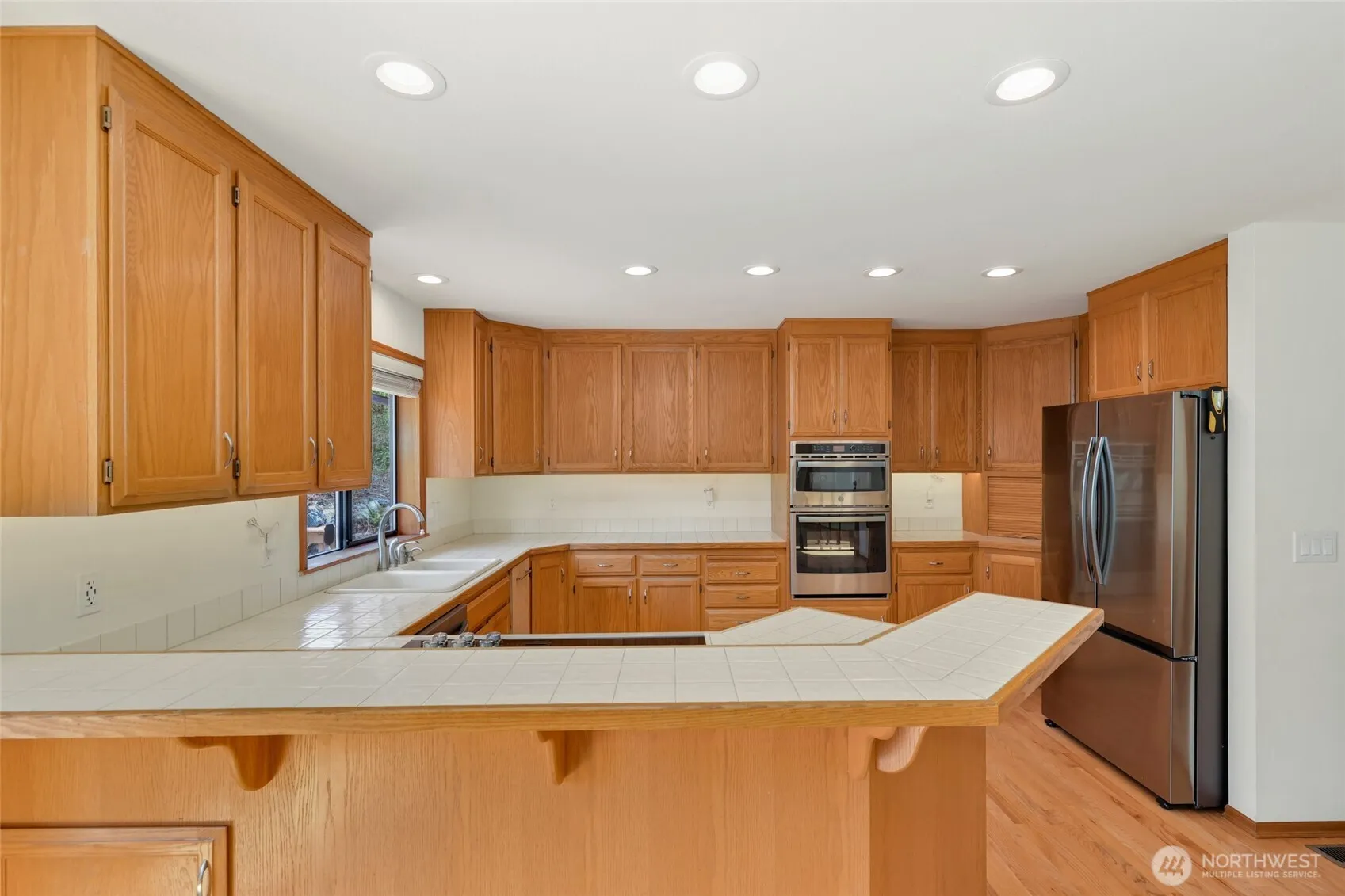 Fall in love with this warm and inviting rambler where comfort meets character and the backyard truly steals the show. On clear days, enjoy stunning views of Mount Rainier while sunlight pours across rich hardwood floors flowing through the entry, kitchen, dining area, and family room. The sunken lounge and vaulted ceilings create a dramatic architectural focal point, offering the perfect space to gather, celebrate, or unwind in style. French doors open to a Trex deck overlooking a fully fenced, private yard that feels like your own secluded retreat. Whether hosting summer barbecues, enjoying peaceful mornings, playing with pets, or gardening in the sunshine, this outdoor space is designed to be lived in and loved. An attached shed provides excellent storage for tools, equipment, or seasonal décor. The spacious primary suite features a walk-in shower, and the grand utility room with tile flooring adds everyday convenience. An oversized three car garage offers incredible room for vehicles, hobbies, and extra storage. With a two-year-old roof, skylights replaced at the same time, new appliances, new carpet and a built-in vacuum system, this home blends function with personality. Homes like this, with warmth, charm, and a backyard made for living, do not last—schedule your showing and make it yours today.