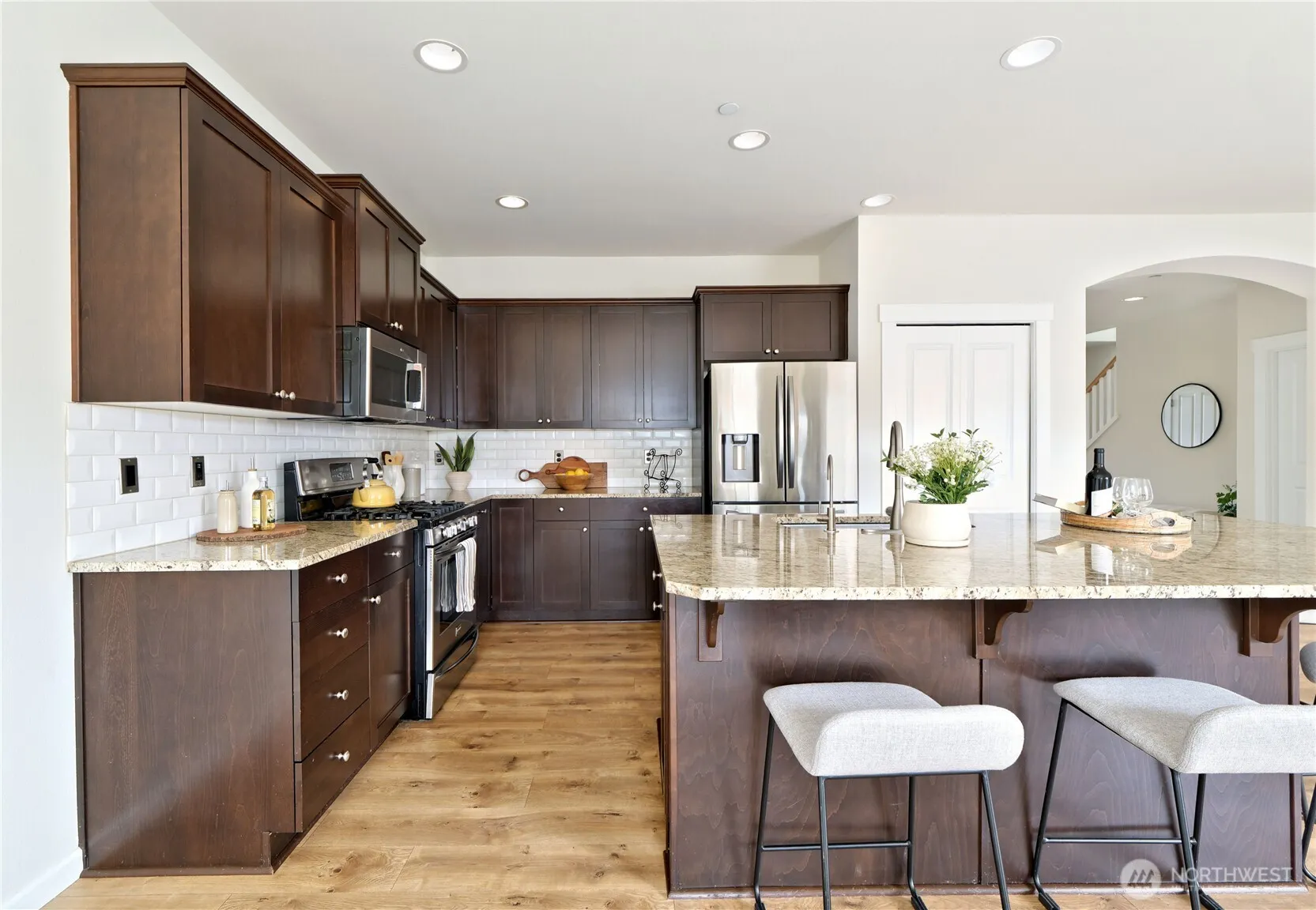 Welcome to Ridgewood Lane, a beautifully crafted DR Horton home located on a quiet cul-de-sac. This residence is equipped with central air conditioning and a tankless water heater, and features soaring ceilings and large windows that fill the home with natural light, creating a bright and open atmosphere. The main living areas are finished with elegant engineered hardwood floors, adding both warmth and sophistication.At the heart of the home is the spacious kitchen, complete with granite countertops, rich espresso cabinetry, stainless steel appliances, and ample prep space—perfect for everyday living and entertaining. The open layout flows seamlessly into the living area, making it easy to gather and connect. A main-floor bedroom (or den) with an adjacent ¾ bath offers flexibility for guests, a home office, or multi-generational living.Upstairs, the primary suite features a generous walk-in closet and a well-appointed en suite bath. Three additional bedrooms and a versatile bonus room provide endless possibilities for a media room, playroom, or work-from-home space. Ideally located with easy access to major freeways, SeaTac Airport, hospitals, shopping centers, dining, and key business hubs, this home delivers exceptional everyday offering both convenience and a sense of security. This move-in ready home is an outstanding opportunity.