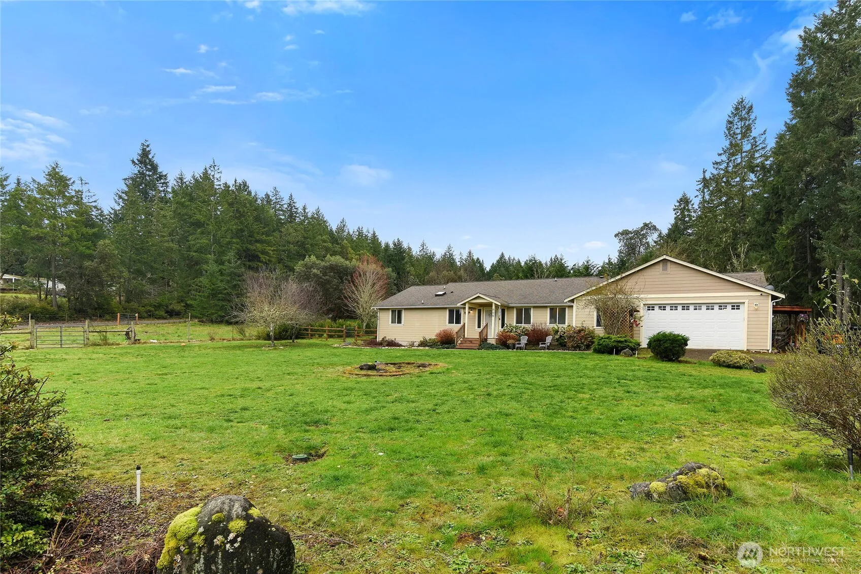 If you’re looking for a multi-generational rambler on acreage with a large shop, the search is over. This expansive single-level home features an attached mother-in-law suite with its own kitchen, bathroom, and private entrance, ideal for aging in place or hosting guests and extended family comfortably. The 2.3-acre lot is fenced and cross-fenced with a gated entry, allowing pets and other four-legged friends to roam securely. With cherry and apple trees plus sunny garden space, this property is ready to bring your hobby farm dreams to life. Step inside to a tiled entryway with vaulted ceilings and abundant natural light streaming in from the backyard. An office or flex room sits to the right with a pass-through door to the kitchen and mudroom, leading to the oversized garage and utility room. The open-concept living room and kitchen make entertaining effortless. A gas fireplace keeps things cozy in winter, while heat pump A/C keeps the home cool in summer. Out back, the deck opens to a private yard with a stone pond and waterfall feature, creating a peaceful retreat. Inside, you’ll find three additional bedrooms, including an expansive primary suite with a fully updated five-piece bath designed for unwinding after a busy day. Outside, the 1,900 sq ft shop with its own 200-amp meter provides space for projects, storage, or hobbies. Country living, room to grow, and space for everyone. Welcome home.