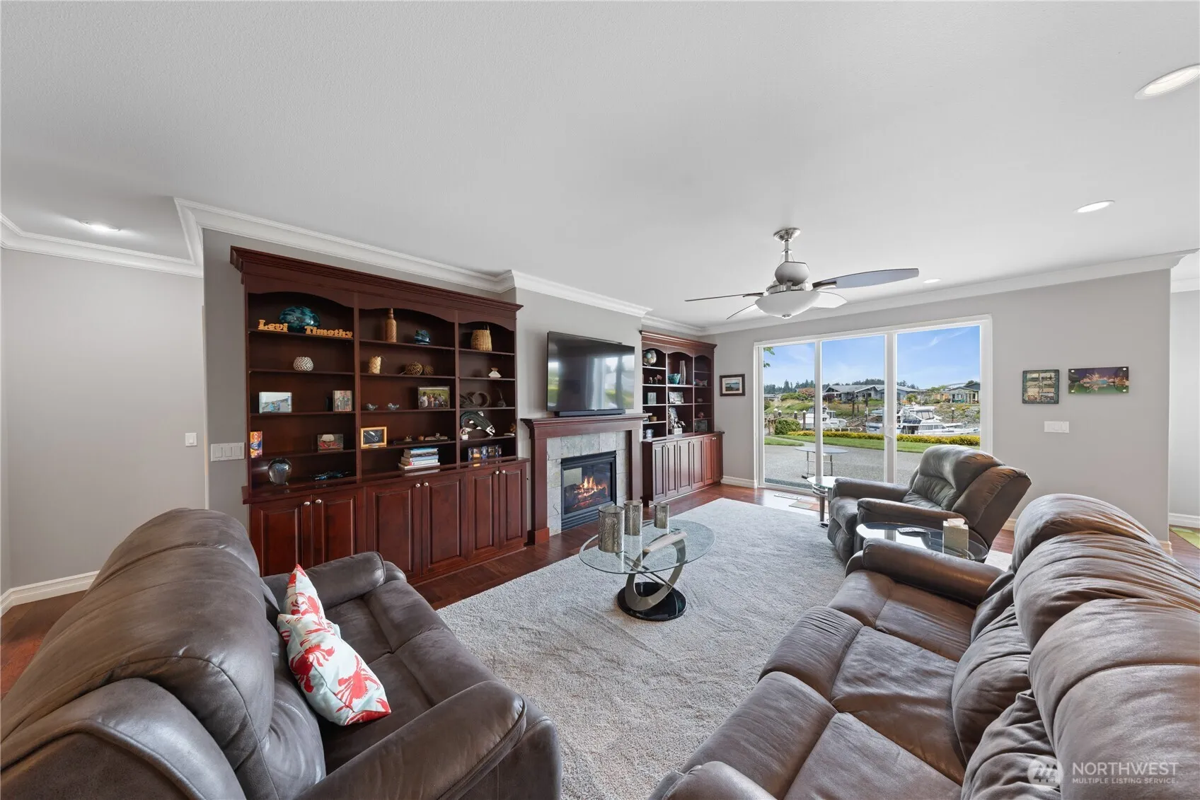 Experience elevated waterfront living in this beautifully maintained single-level home with a 32-ft dock, perfectly positioned in the heart of Shelter Bay. Nearly every room captures stunning marina and water views, creating a seamless connection to the coastal lifestyle. The light-filled living room features a cozy gas fireplace and custom built-ins, opening to expansive windows that frame the ever-changing scenery. The chef’s kitchen is designed for both function and entertaining, complete with a center island, double wall ovens, built-in wine rack, and abundant cabinetry, all flowing effortlessly into the main living spaces. The spacious primary suite is a true retreat, offering a second fireplace, direct patio access, and a spa-inspired ensuite with a walk-in tile shower and double vanity. Step outside to your waterfront patio—ideal for dining, relaxing, and watching the boats go by—just steps from your private dock for easy access to the water. Additional features include a dedicated office, well-appointed laundry room, and thoughtful finishes throughout. Enjoy the full Shelter Bay lifestyle with access to a pool, clubhouse, tennis and sports courts, and a par-3 golf course, all just minutes from the charm, dining, and shops of La Conner. LEASED LAND.