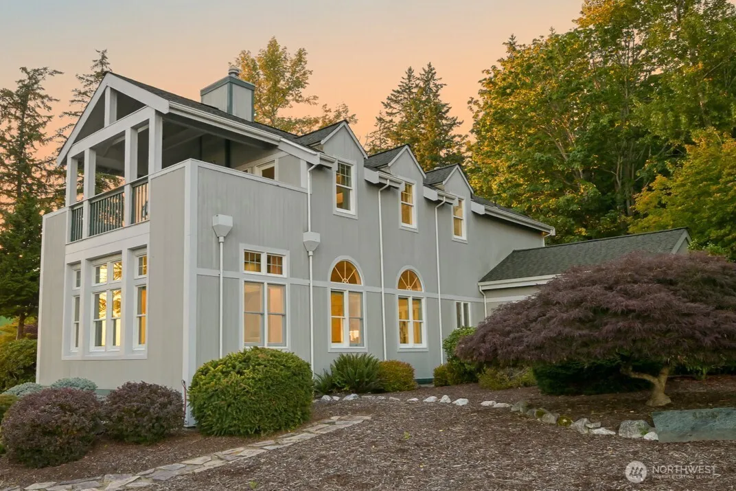 Set above the city on King Mountain, this architecturally designed residence offers a rare combination of privacy, light, and long views stretching across Bellingham Bay to the San Juan Islands. Mornings open to water and sky. Evenings settle into wide, lingering sunsets that fill the room without asking for attention. The main level is thoughtfully arranged for single level living, with generous living and dining spaces anchored by a see through fireplace and framed by oversized windows. Natural light moves easily through the home, creating a sense of openness without exposure. French doors extend the living space to a large sun deck, wrapped in mature landscaping that provides both privacy and a quiet connection to nature, ideal for unhurried meals, reading, or hosting close friends. The upper level is reserved entirely for the primary suite, offering a true retreat. A fireplace, lounge area, and covered deck take full advantage of the home’s elevated position, with sweeping 180-degree views that change with the weather and seasons. It’s a space designed for slowing down, not shutting out. The property itself feels established and settled, while the location remains practical as it is close to parks, trail systems, and everyday amenities, with easy access to I-5 for travel north or south. This is a home for those ready to trade excess for intention, and noise for perspective.
