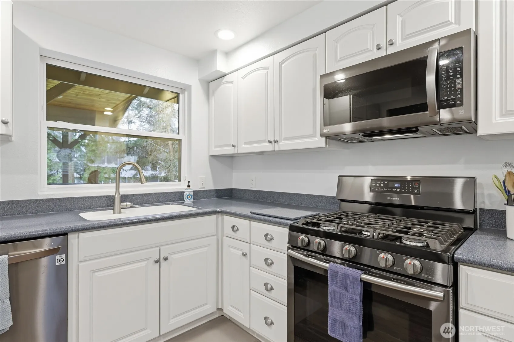 This light-filled 2,298 sq ft residence offers 4 spacious bedrooms and a thoughtfully designed layout, including a full bath, the primary bedroom boasts, ¾ bath with extra built-in storage w/makeup vanity and access to the second large covered deck. The heart of the home is the updated kitchen, featuring a gas stove and sleek newer brushed black appliances—perfect for both everyday living and entertaining, dining space that opens to one of the covered decks and large living room with designer LVP gas fireplace with tile surround, plantation shutters and vaulted ceilings. Downstairs, you’ll find a generous second family room with wood burning fireplace along with a bonus area w/kitchenette, creating an ideal setup for multi-generational living, guests, or extended stays. Step outside to your own private retreat. Situated on a pristine nearly 1/3 of an acre lot, the fully fenced backyard offers two covered decks that seamlessly lead to a relaxing hot tub—perfect for year-round enjoyment. Additional highlights include a new roof (2025) and an on-demand generator, providing peace of mind and modern convenience. This home combines comfort, functionality, and outdoor living in one exceptional package—ready for you to move in and enjoy. Close to everything and yet quiet and peaceful dead end street!
