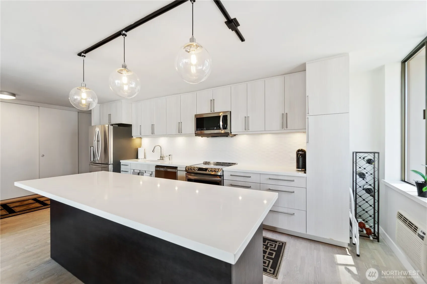 Available Now! Rare opportunity for a 3 bedroom condo with large windows boasting tons of natural light throughout. This corner unit has over 1408 sqft of space, remodeled kitchen, hardwood floors, remodeled bathroom and designer touches throughout. The kitchen is equipped with stainless steel appliances, electric stove top and an open island bar overlooking the living area. the built-in A/c unit will stay with the property located in the living/ kitchen area . Seneca 8 is in the heart of the city featuring a Walkscore of 98 close to shopping, downtown, grocery stores and transit. The building is completed with workout room, private access and community lounge. One assigned garage parking space & storage unit included in the monthly rent.