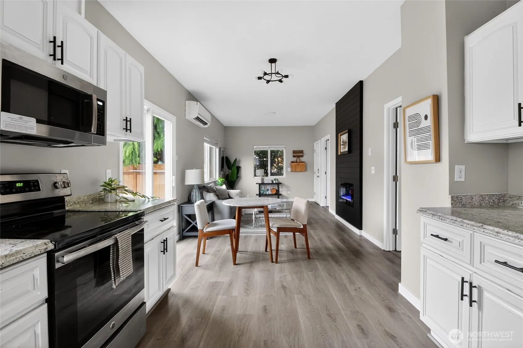 PRICE ADJUSTMENT & LENDER OFFERING 1% BUY DOWN. Welcome to this beautifully updated rambler on a charming tree-lined street. A new cedar front porch welcomes you into a bright, open-concept home featuring 3 bedrooms and a custom-designed bathroom. Recent updates include electrical, plumbing, heating, windows, fresh interior and exterior paint, and new luxury vinyl plank flooring throughout. High ceilings and large windows fill the home with natural light, while a recessed electric fireplace adds warmth and style. Stay comfortable year-round with a Mitsubishi mini-split system providing efficient heating and A/C. Enjoy the new deck overlooking the landscaped yard, plus a designated parking space behind the home and additional parking in front. Basement offers extra storage. Conveniently located minutes from downtown Everett, I-5, restaurants, and the Everett Transit Station.