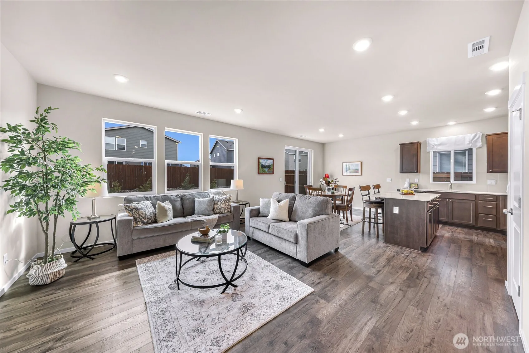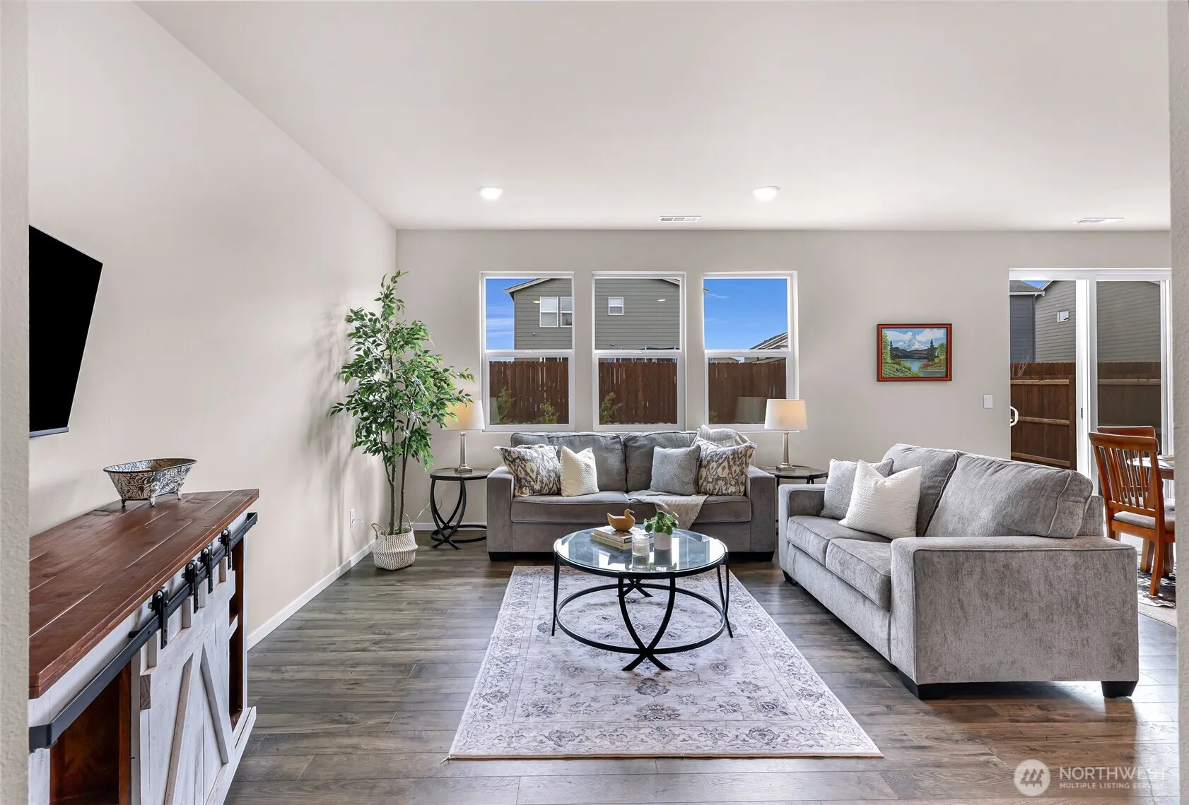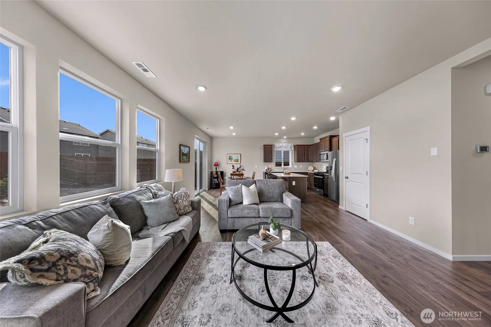 Welcome home to Black Horse by DR Horton! This immaculate, nearly new Sherwood plan offers 4 bedrooms, 2.5 baths, and 1,764 sqft of thoughtfully designed living space. Enjoy 9-ft ceilings and durable luxury vinyl plank flooring throughout the main level. The striking kitchen shines with quartz countertops, gas range, full-height tile backsplash, and a spacious pantry perfect for everyday living and entertaining. Upgraded bathrooms feature elegant marble countertops, while added comforts include A/C, smart home features, and front yard irrigation. Situated on a desirable 4,374 sqft end lot beside a community trail, providing extra privacy and buffer between neighbors. The backyard boasts a wrap around patio and low-maintenance landscaping offering a blank canvas ready for you to come in and create your vision of a dream oasis.