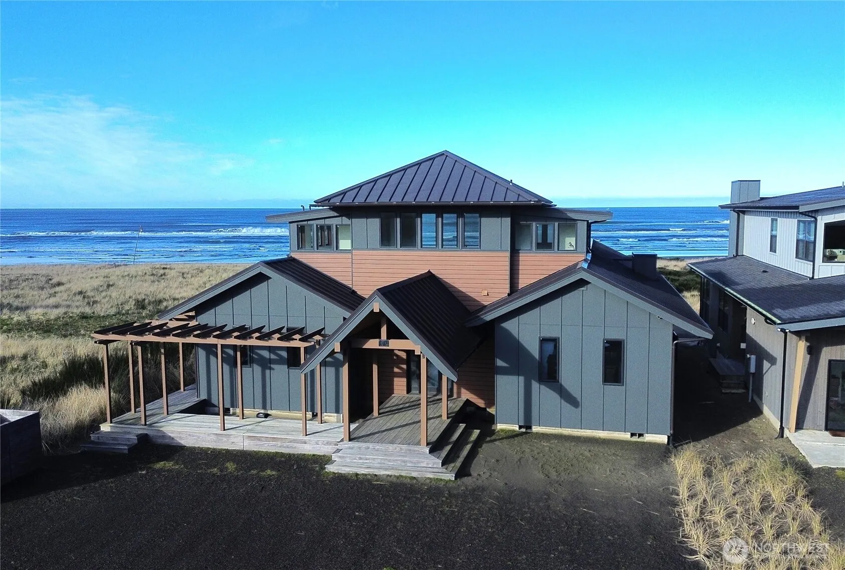 Opulent Oceanfront! This architecturally striking coastal residence blends refined contemporary design with modern Craftsman warmth. Set against the dramatic backdrop of the mighty Pacific Ocean, the home features a commanding multilevel roofline, expansive glazing designed to capture sweeping coastal views, and a sophisticated mix of natural textures and coastal-toned finishes. The grand covered entry and pergola framed outdoor living spaces creates a seamless indoor-outdoor flow, ideal for elevated entertaining. Thoughtfully designed for both comfort and resilience, the home pairs luxury materials with timeless Northwest craftsmanship, delivering a serene, design-forward retreat by the sea. Westport is the closest ocean beach from I-5 offering ocean sport fishing, surfing and under permitting, an oceanfront Scottish Links Golf Course designed by David McLay Kidd just a few minutes away! This one-of-a-kind home perches dramatically overlooking the most beautiful beach in the state. Compare to Seabrook and you will immediately recognize the difference!