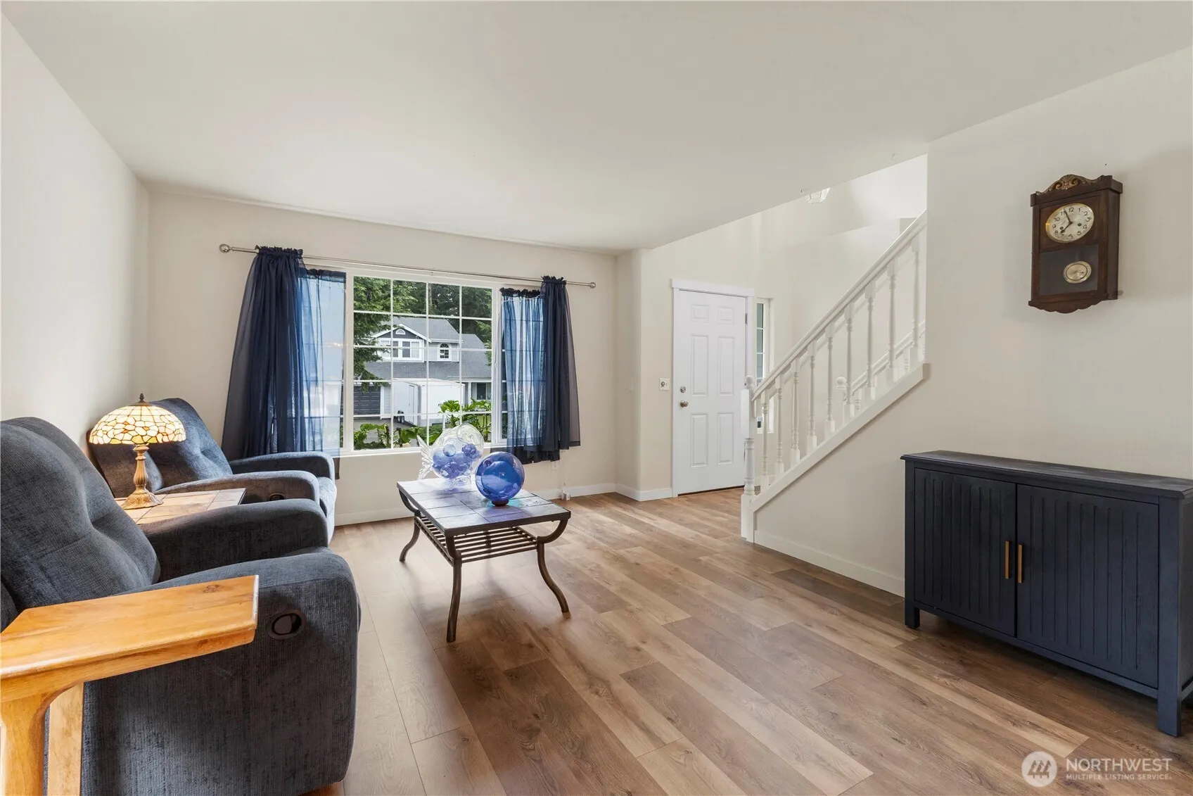 Large 17,193 sq ft lot • 2024 interior remodel • Covered deck • 3 bedrooms + bonus room! Two-story home on a over a third acre lot in Graham with 3 upstairs bedrooms plus a large bonus room and 2,146 sq ft of interior living space. Main level includes a living room, dining and family room with a wood burning fireplace plus an eat-in kitchen. Entire home interior was remodeled in 2024 with new kitchen and bathroom cabinets, all new appliances and with laminate flooring throughout main living spaces, new vinyl flooring in bathrooms and laundry room, and wall-to-wall carpet in all upstairs living areas. Kitchen and living areas connect to a large covered deck overlooking the fully fenced backyard, providing outdoor space and room for yard use. Attached three-car garage with driveway parking and wired for a generator. Located on a quiet, dead end street with convenient access to Meridian Ave E retail and services.