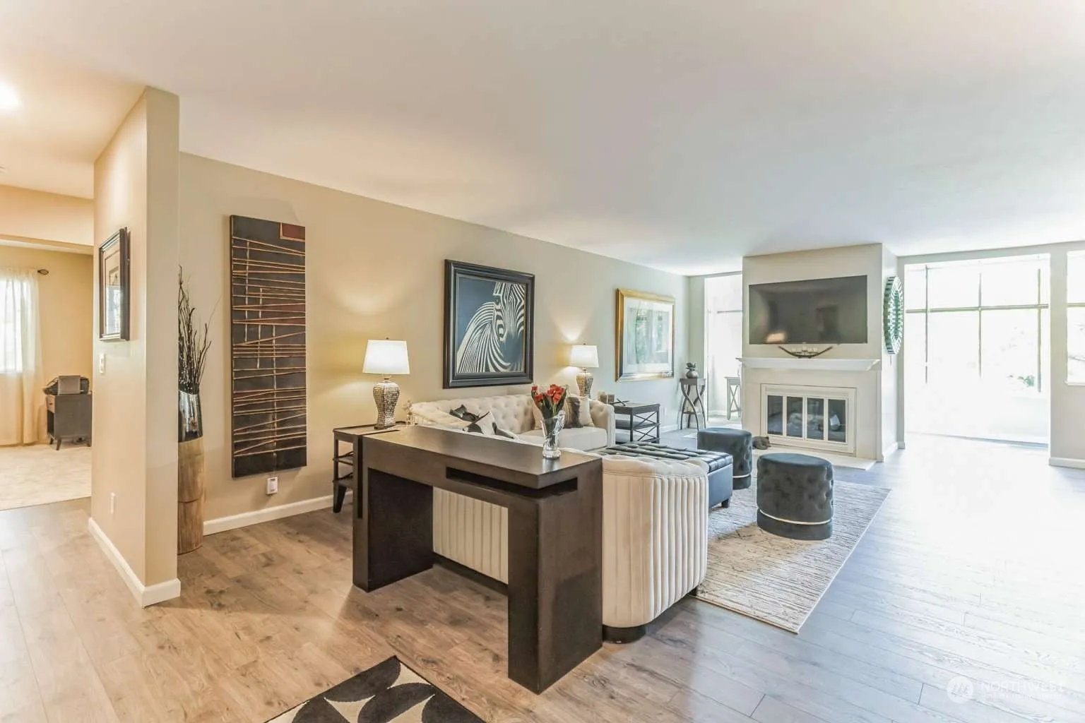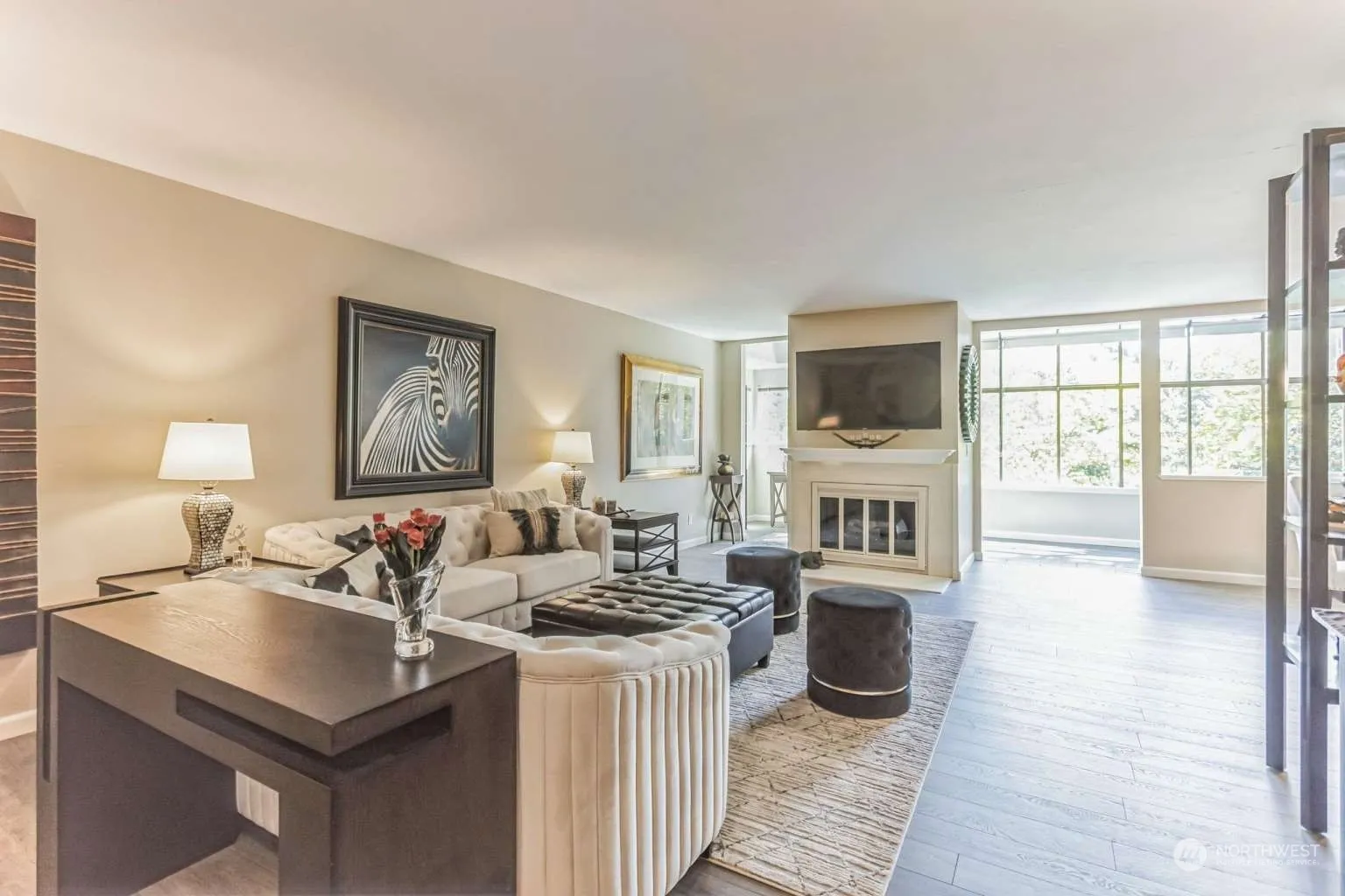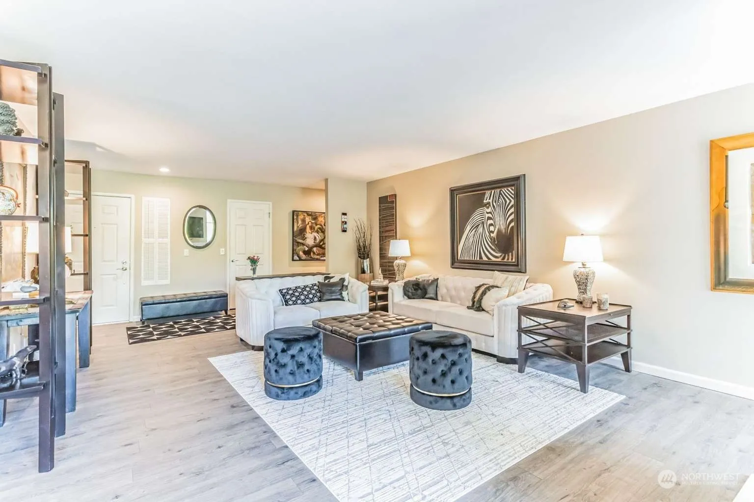 This top floor, corner unit (the largest in the Devington building) is spacious and light-filled with lovely tree and territorial views through the south-facing atrium windows, and partial Cascade mountain views through both bedrooms. Located in the heart of downtown Mercer Island within walking distance of many grocery stores, shops, restaurants, light rail, parks and walking trails. All the wonderful downtown places on Mercer Island are just steps away. This location allows anyone to enjoy last-minute shopping, happy hour or a special dinner out without driving! Beautifully updated unit including a new kitchen, master bathroom with multiple shower heads & heated floors and engineered wood flooring. No noise from above!