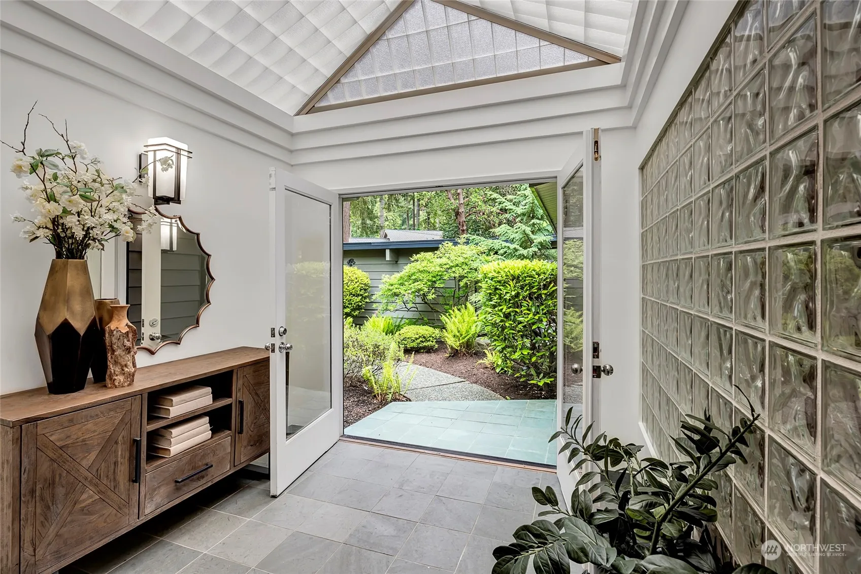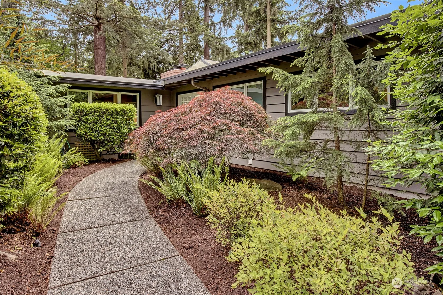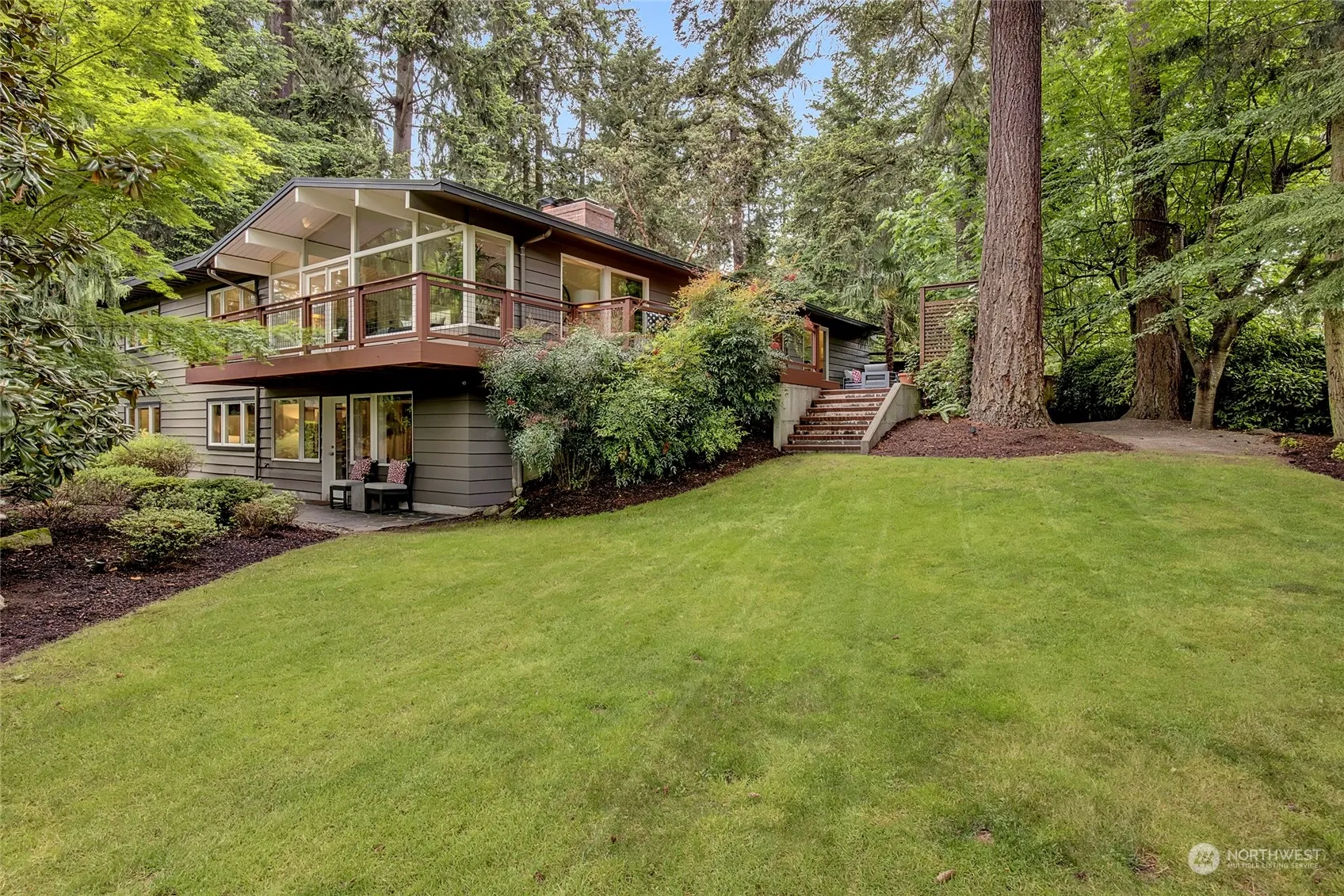 Welcome to this stunning mid-century modern home located on the south end of Mercer Island, tucked away down a quiet & private lane. It’s the perfect retreat for outdoor living, featuring a patio & deck that overlook a breathtaking backyard oasis with a lush, level lawn that feels like your own private park. This home offers a perfect blend of timeless design & contemporary luxury. The light & bright entry flows into the living/dining rooms, showcasing vaulted ceilings, cozy fireplaces, & walls of windows that bring the outdoors in. The open kitchen, complete w/cherry cabinets, a wet bar w/wine fridge, and an enormous pantry, makes entertaining a breeze. Additional bonus room on the lower level is perfect for movie nights or game days.
