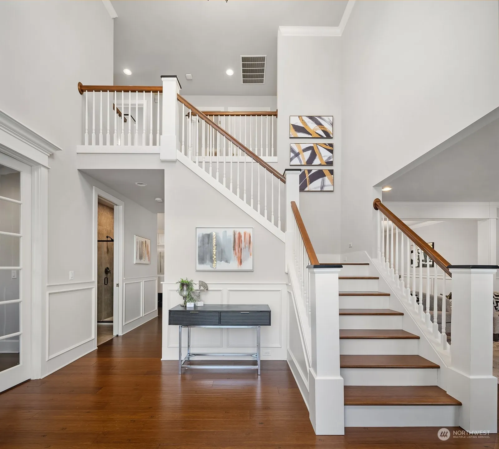 Classic Federal-Style residence with contemporary flair in a private cul-de-sac. 4 bedrooms + main floor den/guest suite with connecting 3/4 bath, hardwood floors on main level and stairs, gourmet kitchen with Thermador appliances, including wine fridge, marble countertops, glass tile backsplash, ceiling height cabinets, and large pantry. Spacious master suite, extra large walk in closet, master bath with heated floor, rainfall + standard shower heads, jetted tub. Generous closets in all the bedrooms. Like new, front loading washer & dryer. App controlled smart home systems, Wired for high efficiency EV charger, 2 water heaters. Expansive deck and serene greenbelt on west and south sides, minutes from the Country Club and south-end shopping