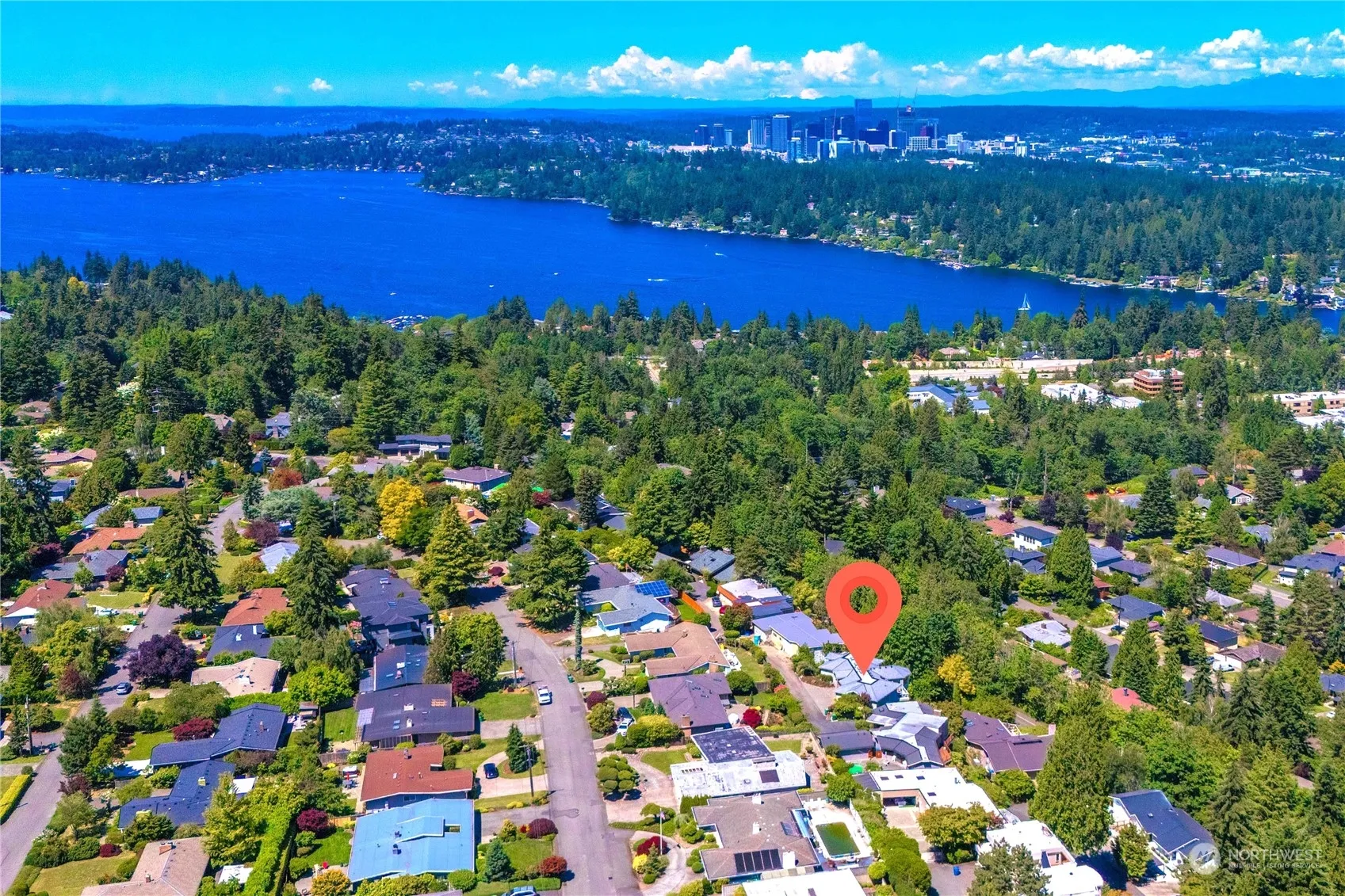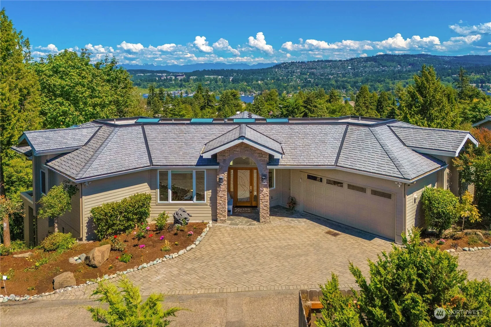New & Best Price! Elegant Mercerwood custom view home by Bender-Chaffey boasts a dramatic entryway that opens to expansive vistas of Lake WA, Newcastle Golf Course & the Cascades. Sprawling open concept captures views from nearly every room. Renovated in 2012 w/ masterful craftsmanship, exquisite millwork, & upscale finishes. Luxurious primary suite on main is complemented by a spa-like bathroom. Durable tile roof, low-maintenance TimberTech decks, hardwood floors, vaulted ceilings, a fireplace, & A/C add to the allure of the sun-drenched main living area. 9-foot ceilings at the lower level offer flex space plus a second office. Tucked away in a private drive, this home is close to dining, shopping, parks, & I-90 access. Walk to schools.
