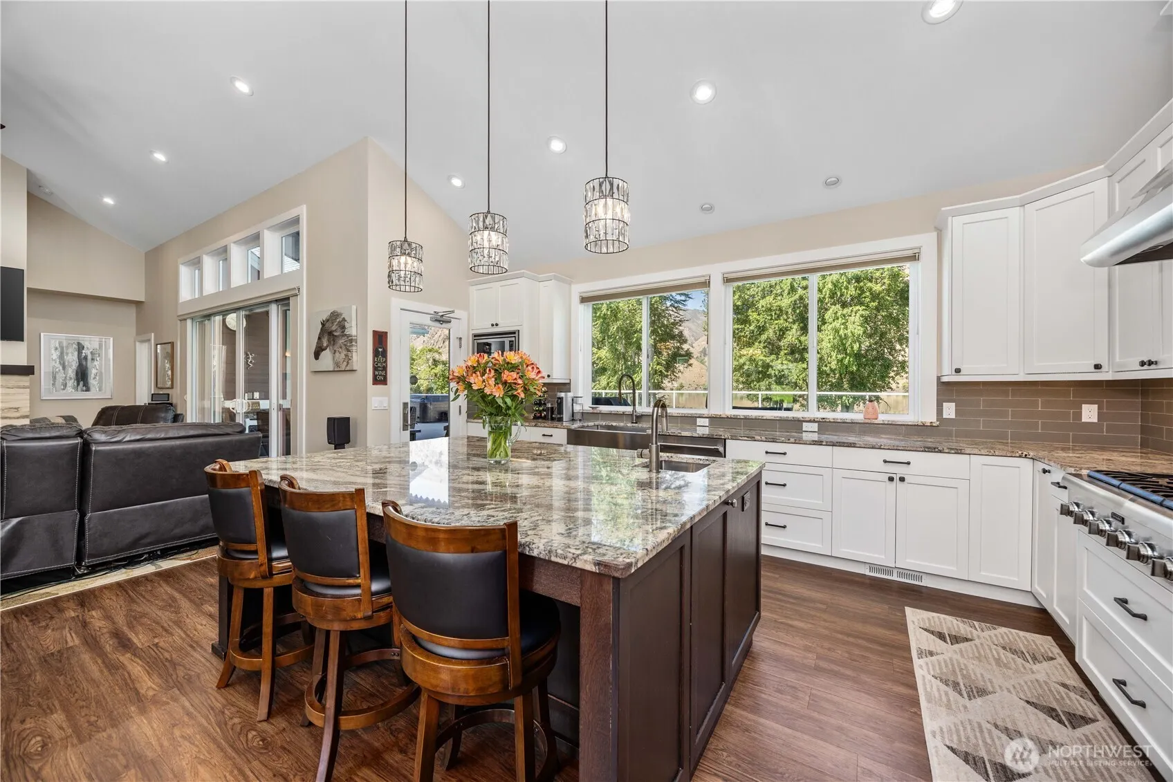 Discover this lovely unique custom-built 4 bedroom 2 ½ bath home that sits on a full acre with a 140’ of no bank waterfront. This one level home was finished in 2018 and has exquisite architecture. Inside you’ll find 12-ft-vaulted ceilings, beautiful LVP flooring, Hunter Douglas blinds with black out blinds in the bedrooms, and lifetime Milgard windows. Enjoy the view of the river, hills and soaring eagles through the sliding doors from the open concept great room, which also has a gas fireplace. The Chef’s kitchen is a dream with Thermador appliances – double ovens, 6-burner gas cooktop, custom built cabinets, granite countertops, a large center island with prep sink and a built in KitchenAid cabinet lift. The primary suite has a walk-in shower, heated floors and sliding doors leading to the patio where you’ll find a hot tub and beautiful 18’ x 36’ gunite swimming pool with a brand-new auto cover. Included on the patio deck is an extendable awning for shade and cabana for entertaining. Don’t miss the 1840 sq foot heated and cooled shop/garage with special features that include 18’w x 12’h doors, a car lift, air compressor, epoxy floors and 46’ x 10’ overhead storage. A detached large garden shed also sits on the property. The fully irrigated grassy yard leads to the water’s edge, and just a short walk from there, you’ll find the community dock which includes a spot for each owner.