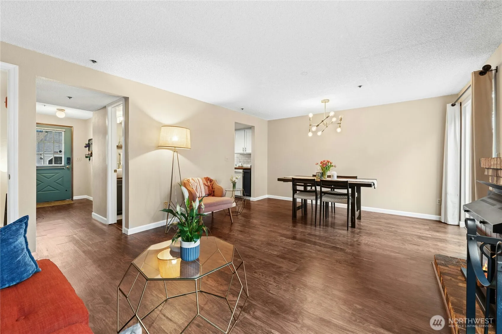 Carriage Row Condominium is a unique complex, Units rarely available, well cared-for, each unit exterior thoughtfully designed with individual character. Last special assessment completed major improvements replacing roofs, windows, sliding glass doors, siding, exterior painting and trex-type decking. This townhome-style unit, one of the largest in the complex has 1588 sf, 3 bedrooms on upper level (including primary), full bath is accessible also from primary bedroom), and full size washer and dryer. The main level entry has newer laminate flooring, refreshed painted doors and base moldings, a sizable kitchen with freshly painted cabinets, 1/2 bath, dining area and living room with brick mantle and wood burning insert, with access to deck for barbequing, plants, and seating to enjoy a quiet space. Main level has radiant floor heating. Downstairs is a special living space with an additional family room fitted with an overhead projection unit and full wall screen for your favorite movie and access to patio and shared backyard plus an extra finished room (currently used as exercise room) and with plenty of storage. New carpet throughout too. Additionally, the unit comes with an individual one car garage + an extra uncovered parking space (12), both right in front of the unit. Plenty of guest parking is available. Close to I-5, 167, Light Rail, and Bus route. No special assessment and ready to move right in!