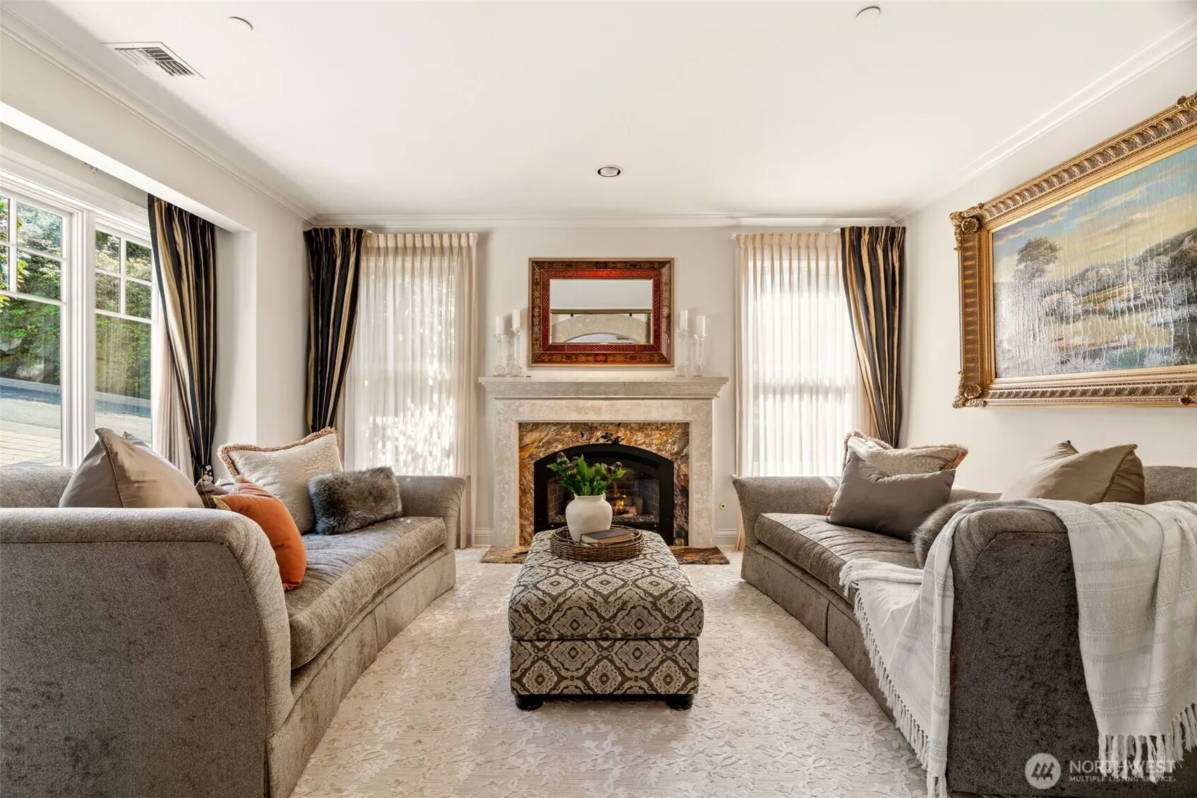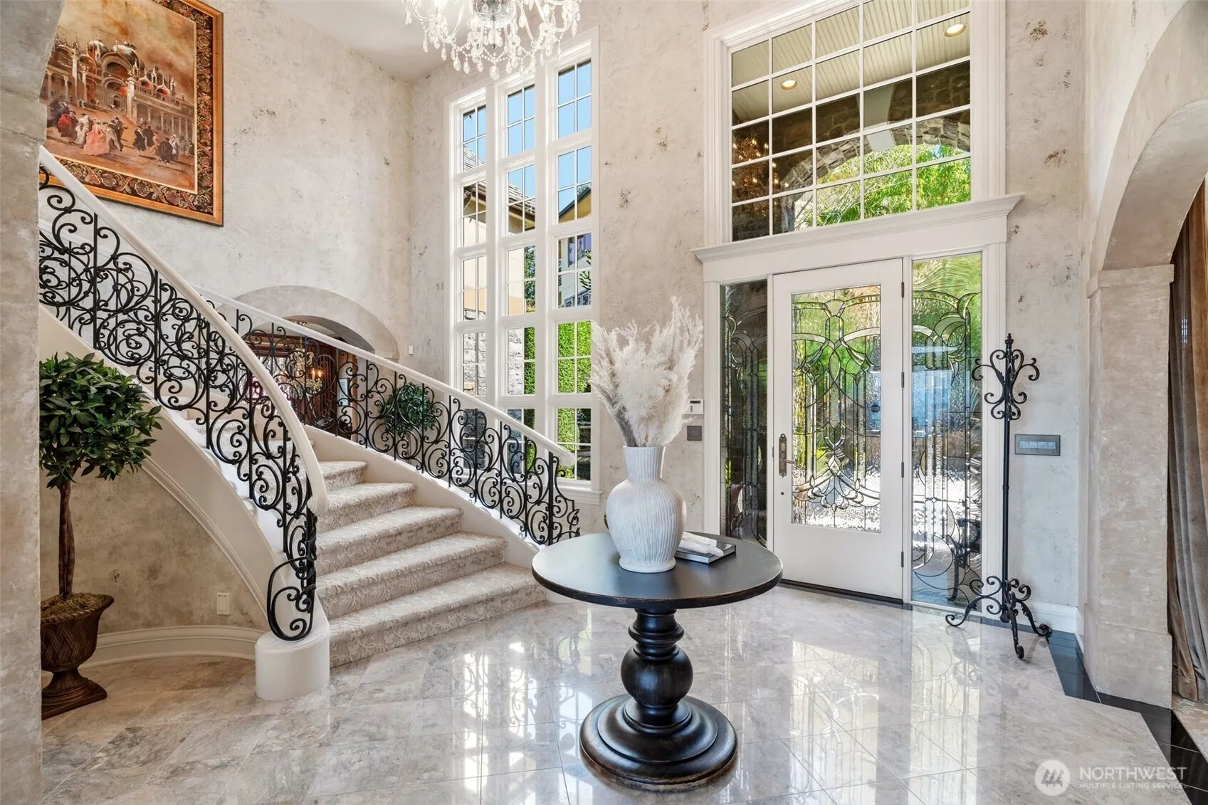 Inspired by the timeless elegance of a French Château, this exquisite Edmonds estate captures sweeping views of Puget Sound and the Olympic Mountains. Custom-built in 2001, this private residence blends old-world craftsmanship with modern sophistication. A dramatic marble entry and sweeping staircase set the tone for gracious living, accented by a sparkling crystal chandelier. The chef’s dream kitchen features double ovens, a pizza oven, travertine and marble countertops, and rich hickory hardwood floors. Retreat to the luxurious primary suite offering a spa-inspired bath, cozy sitting room, and private laundry. Additional highlights include a stunning library, temperature-controlled wine cellar, radiant heat, air conditioning, sauna, and gym. Beautifully designed grounds complete this spectacular setting—an extraordinary home where elegance meets comfort.