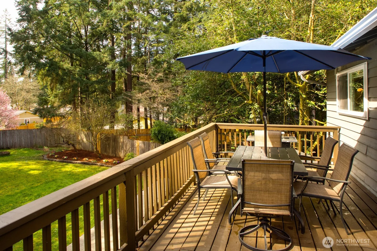 Welcome to this thoughtfully designed for comfort, entertaining, and functionality home. Brand New High Efficiency Furnace. Upgraded Electrical panel to accommodate a Tesla Surcharger and Generator. The open layout seamlessly connects the kitchen, dining, and living areas to a spacious outdoor deck, offering ideal flow for gatherings and everyday living. Enjoy brick fireplaces on two levels, main-level bedrooms with a full bath, and a guest half bath for added convenience. The updated kitchen features a brand new gas convection range, tile floors, custom soft-close cabinetry, stainless appliances, granite countertops, an island with seating, and a skylight for natural light. Glass doors open from the dining area to a large outdoor deck for dining alfresco. Built-in bookcases and a huge 80” mounted TV add movie night and game day fun to the lower-level family room. Whole-house high-speed internet and surround sound wiring on both levels provide modern amenities. A lower-level office space with an additional full bath adds flexibility for a work-from-home option. Step outside to an enormous, fully fenced backyard with a covered brick patio and a garden shed for extra storage. EXTRA—a brand new, 20×12 permitted outbuilding with electricity is ideal for a hobby/craft/pottery atelier or yoga studio. This property blends warm fall and winter indoor cozy spaces and contemporary features with fabulous spring and summer outdoor living, giving it a PNW Living 5-STAR rating.