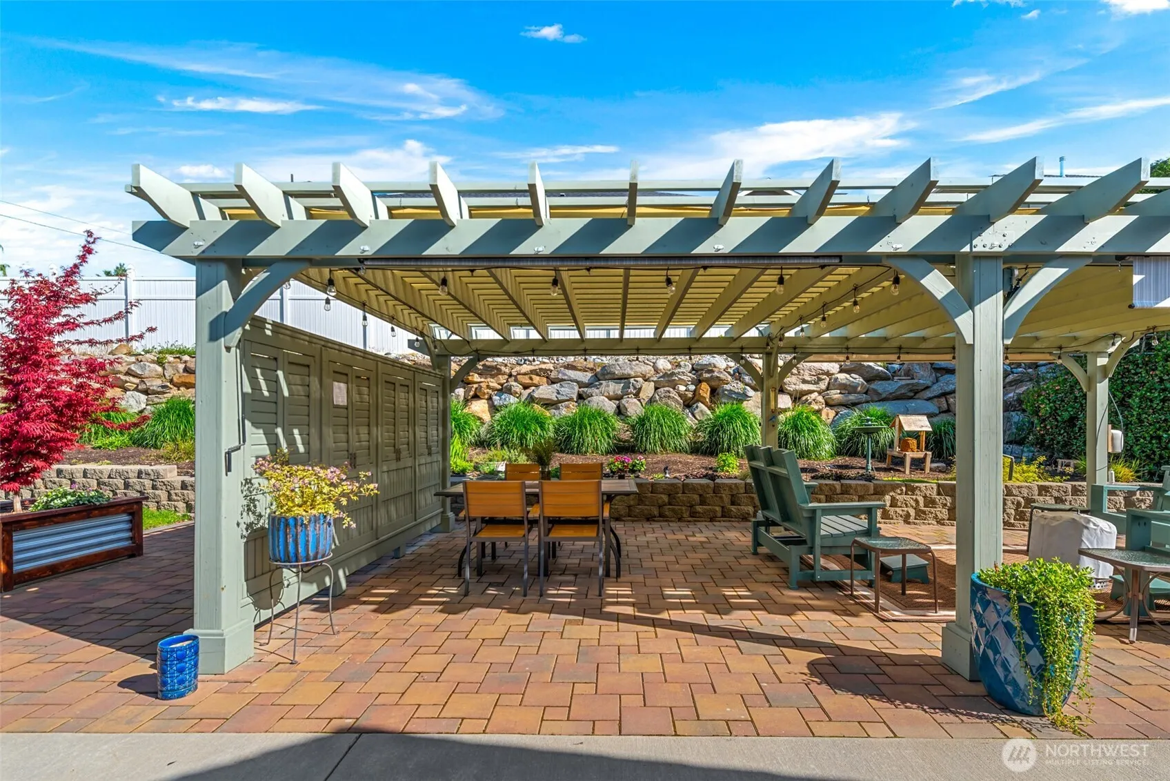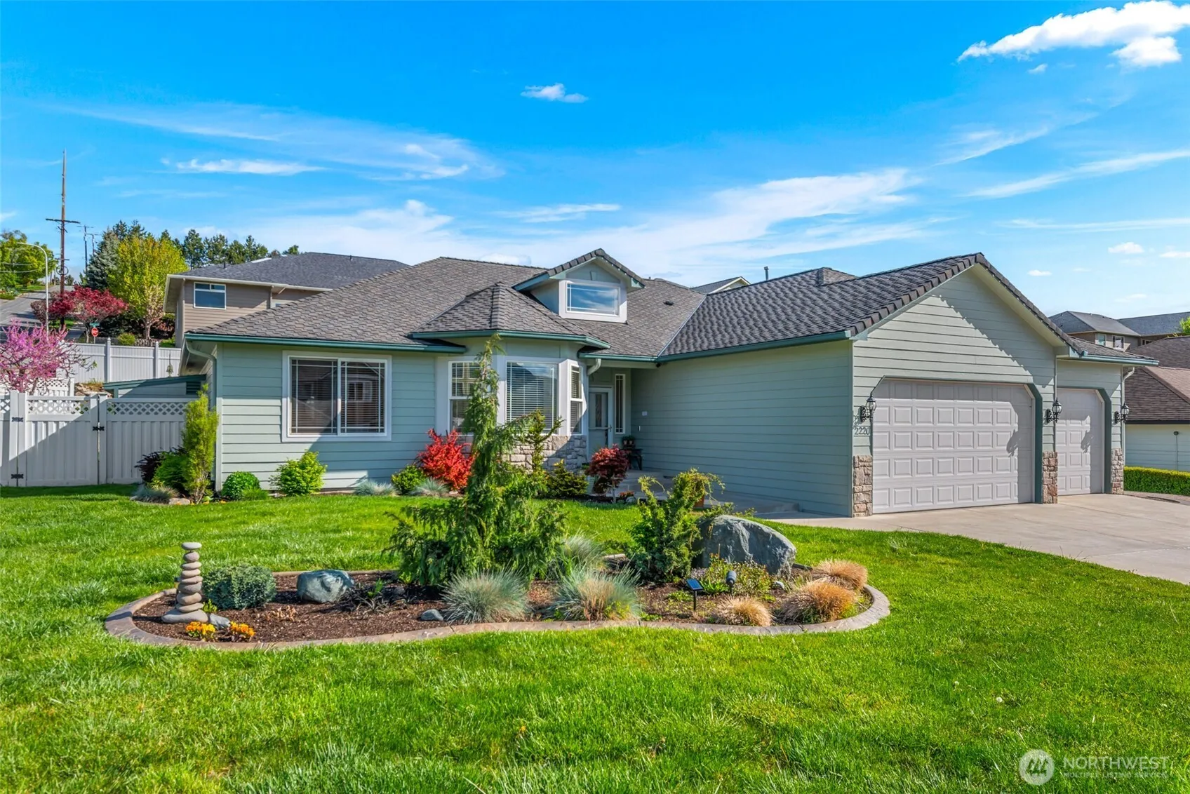 This beautifully maintained 3-bedroom, 2.75-bath custom rambler on a spacious lot and blends comfort, efficiency, and thoughtful upgrades throughout. Enjoy peace of mind with a brand-new 50-year Presidential roof and a one-year-old Lennox heat pump, providing excellent energy efficiency and year-round comfort. A French drain system has been installed along the rear gutters to ensure proper drainage, while motion detectors add extra security. Inside, the home features new lighting and ceiling fans throughout, creating a bright and welcoming atmosphere. The living space is anchored by a cozy natural gas fireplace, fully connected to the gas line for reliable warmth and ambiance. Outdoor living shines with a custom arbor designed for entertaining. The backyard patio includes roll-up privacy screens and adjustable shutters, allowing you to easily adapt the space for sun, shade, or changing weather. The primary suite offers a relaxing soaking tub, providing the perfect retreat at the end of the day. A flexible office with a Murphy bed makes hosting guests simple while maintaining a functional workspace. Car enthusiasts, hobbyists, or DIYers will appreciate the 220-volt heated workspace garage, ideal for tools, projects, or year-round use. The home also includes a 50-amp EV charging outlet, perfect for electric vehicles. The property is beautifully landscaped with decorative concrete curbing and generous outdoor space—perfect for relaxing, entertaining, and enjoying the outdoors.