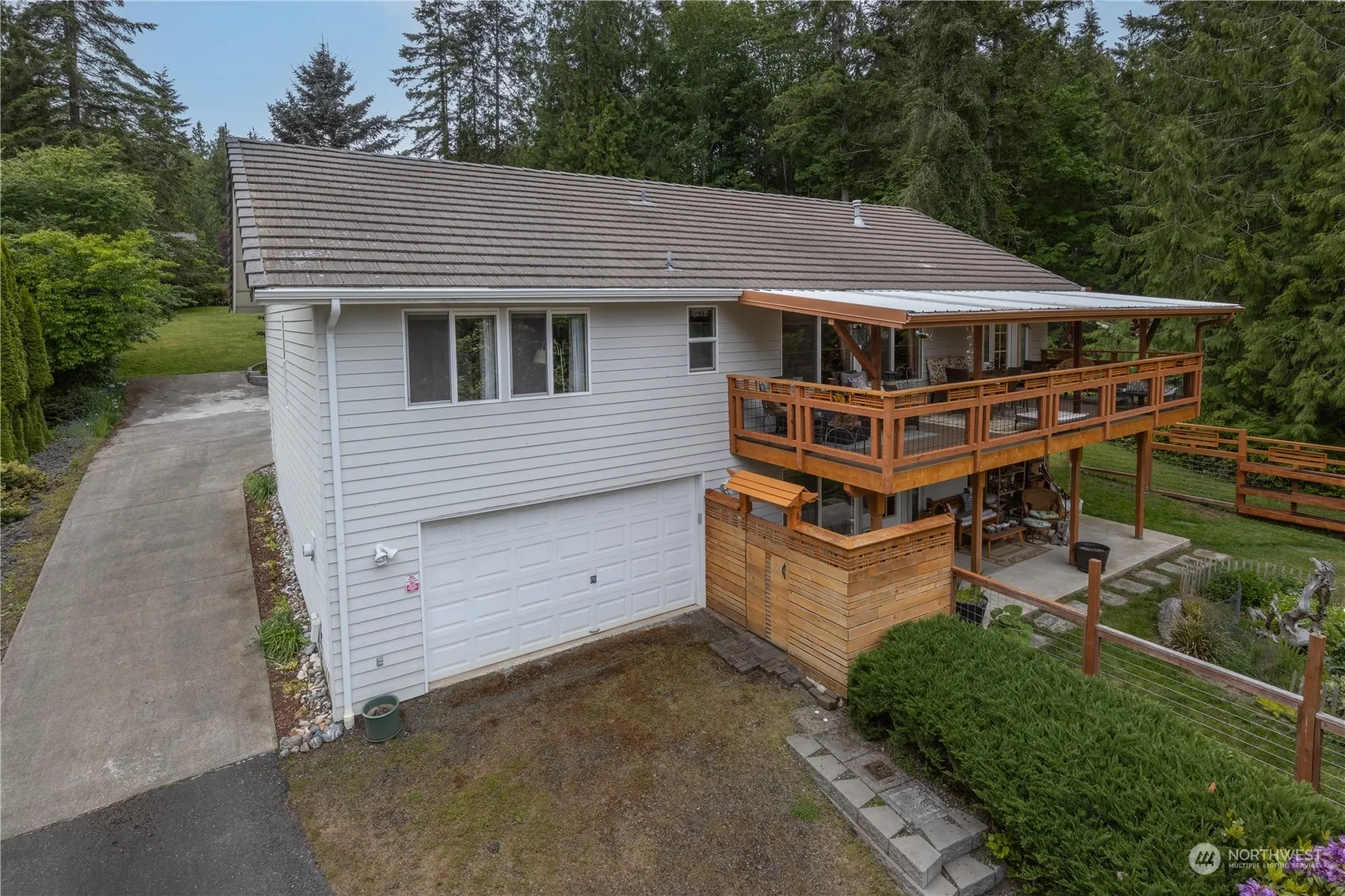 Lovely updated home w/TWO garages, 3 skylights, walkout basement, sauna. New kitchen and appliances, granite countertops, kitchen island w/butcher block top, pup-proof vinyl plank flooring, hall & primary baths w new sinks, fixtures, & countertops; custom closets & pantry storage. 2 6-panel window doors w/sidelights & decorative trim; custom red front door lets in light. Exterior: new upstairs deck with roof and sunlight panels, composite flooring; concrete patio; 3 French drains installed to direct water runoff, 3 retaining walls; gardens, HOA approved fence in front. North Bay is the perfect location for fur-friends with fences allowed and miles of hiking trails. Amenities: park, gym, 2 pools, athletic courts, classes & events, & more