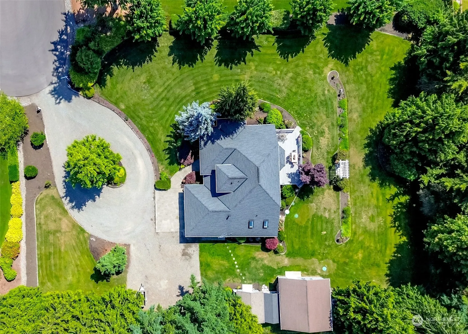 Updated custom home on fully landscaped acre lot w/Mountain View! Want that rural feeling but need to be close to amenities? This is the home for you. High Vaulted ceilings welcome you. The spacious living & dining rooms w/loads of windows letting in natural light. A den is off the entry. The hardwood floors lead you into updated kitchen, eating nook & family room. Updated Kitchen & Baths include quartz tops, SS appliances & 2 ovens! Your primary BR is on Main floor, w/updated 5 piece, ensuite bath. Laundry next to primary. Enjoy the entertainers sized deck & view of Mt Rainier. Upstairs~2 more good sized BR’s, full Bath + large storage. Includes AC. Main house @2548sqft + 576sqft detached office/living space w-1/2 bath. Home Warranty.