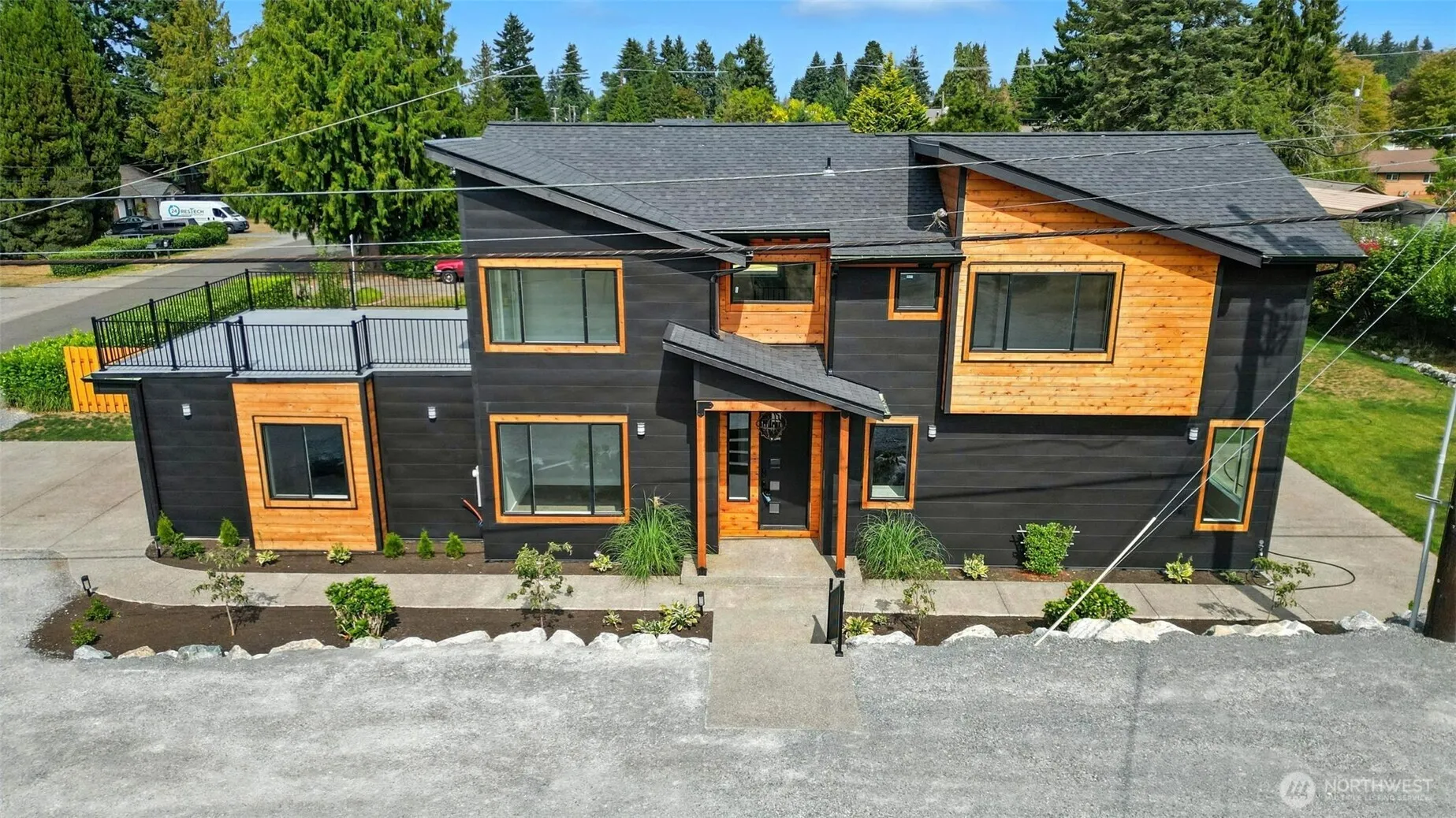 New construction bespoke 2025 contemporary in University Place: 4 bedrooms and 3 full baths, each custom-tiled. 2,110 SF on a 7,467 SF lot. Bold modern lines, warm wood accents, and expansive windows bathe the interior in light. Enjoy a rooftop terrace over the garage for sunset lounging, a fenced yard with fresh landscaping, and an attached 2-car garage with a 240-volt EV outlet. Stylish kitchen with stainless steel appliances, quartz counters, and a waterfall-edge island. Flexible bedrooms suit, guests, hobbies, or work-from-home. Energy-efficient mini-split heating and cooling. Open-plan great room/kitchen/dining with an adjacent sunroom opening to the patio. Home Warranty (Gold Plan) included. Move-in ready.