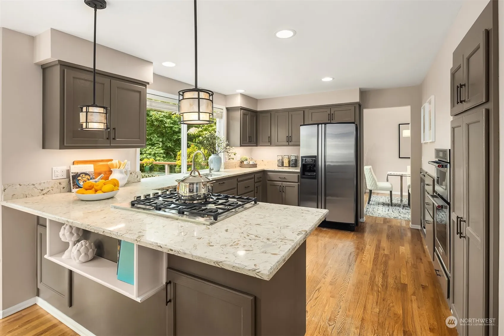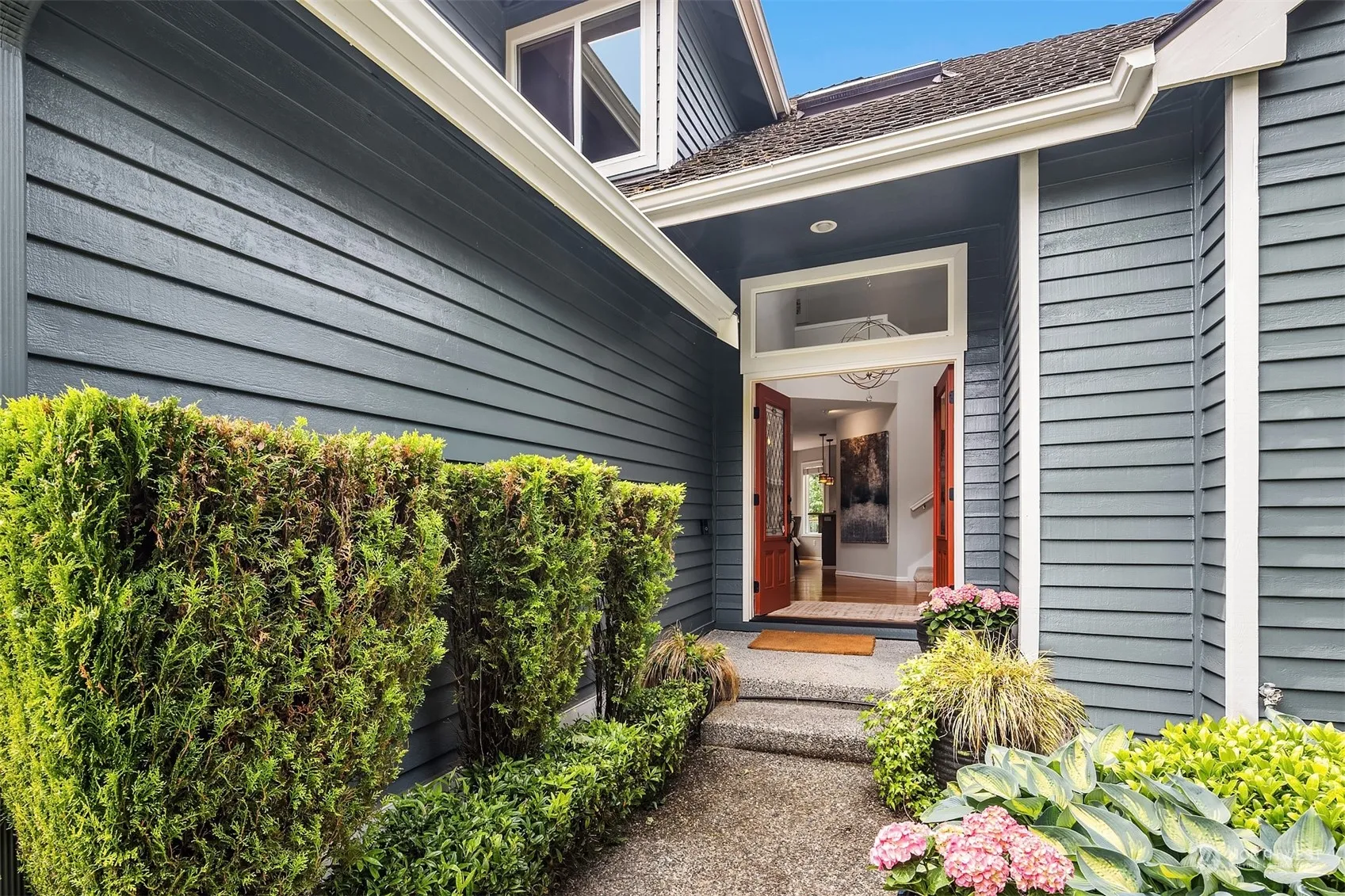 Beautifully updated home and gardener’s paradise in sought-after Olympus, designed for life’s pleasures. Stunning Mt Rainier views. Huge western facing deck overlooking beautiful low maintenance gardens with drip system and greenbelt below. Flowering trees. Private sunset evenings with nature, but on a friendly cu-de-sac. Updates: quartz counters, appliances, carpet, paint, new hardwood flooring in LR. Vaulted ceilings & generous rooms w/ built-ins, spacious, sunny primary en-suite & large closet. Massive enclosed storage/workshop & fenced dog run, or future play area, under deck. New state of the art heat pump & air filtration system (over $50K). Level driveway, 3 car garage. Steps from Lake Boren Park and close to all Newcastle amenities.