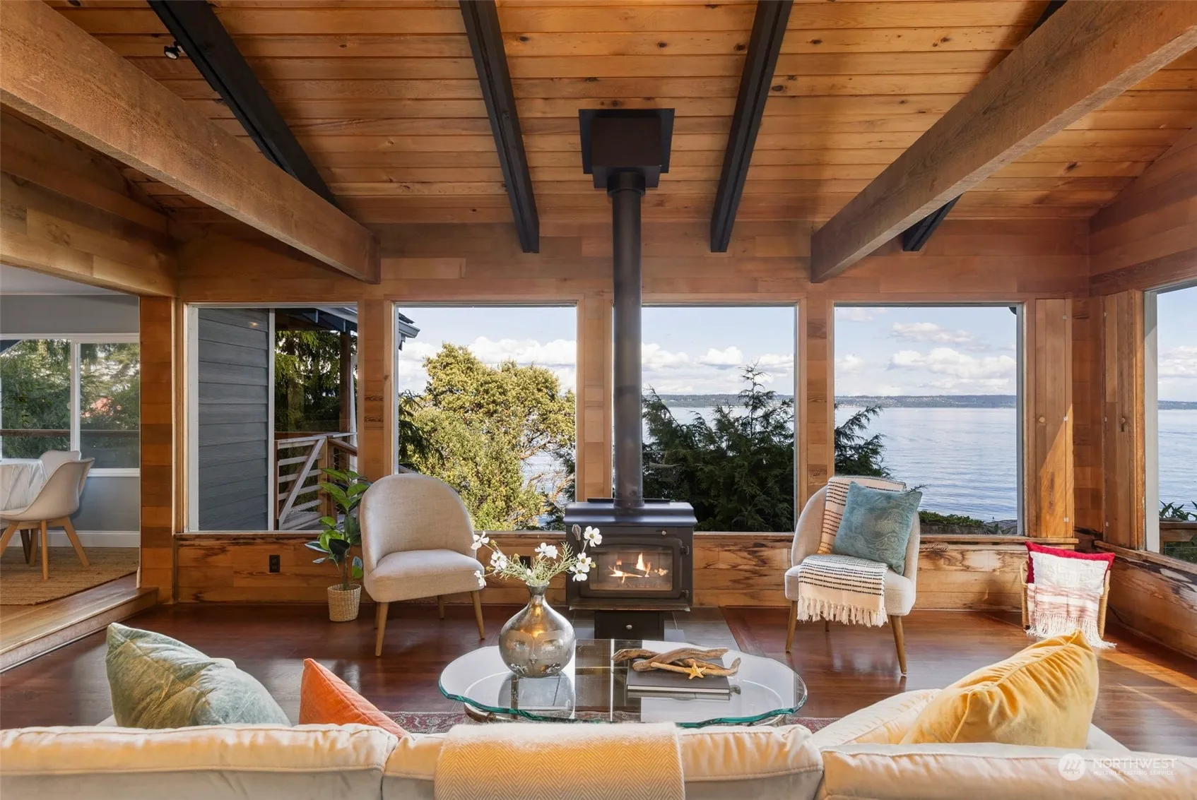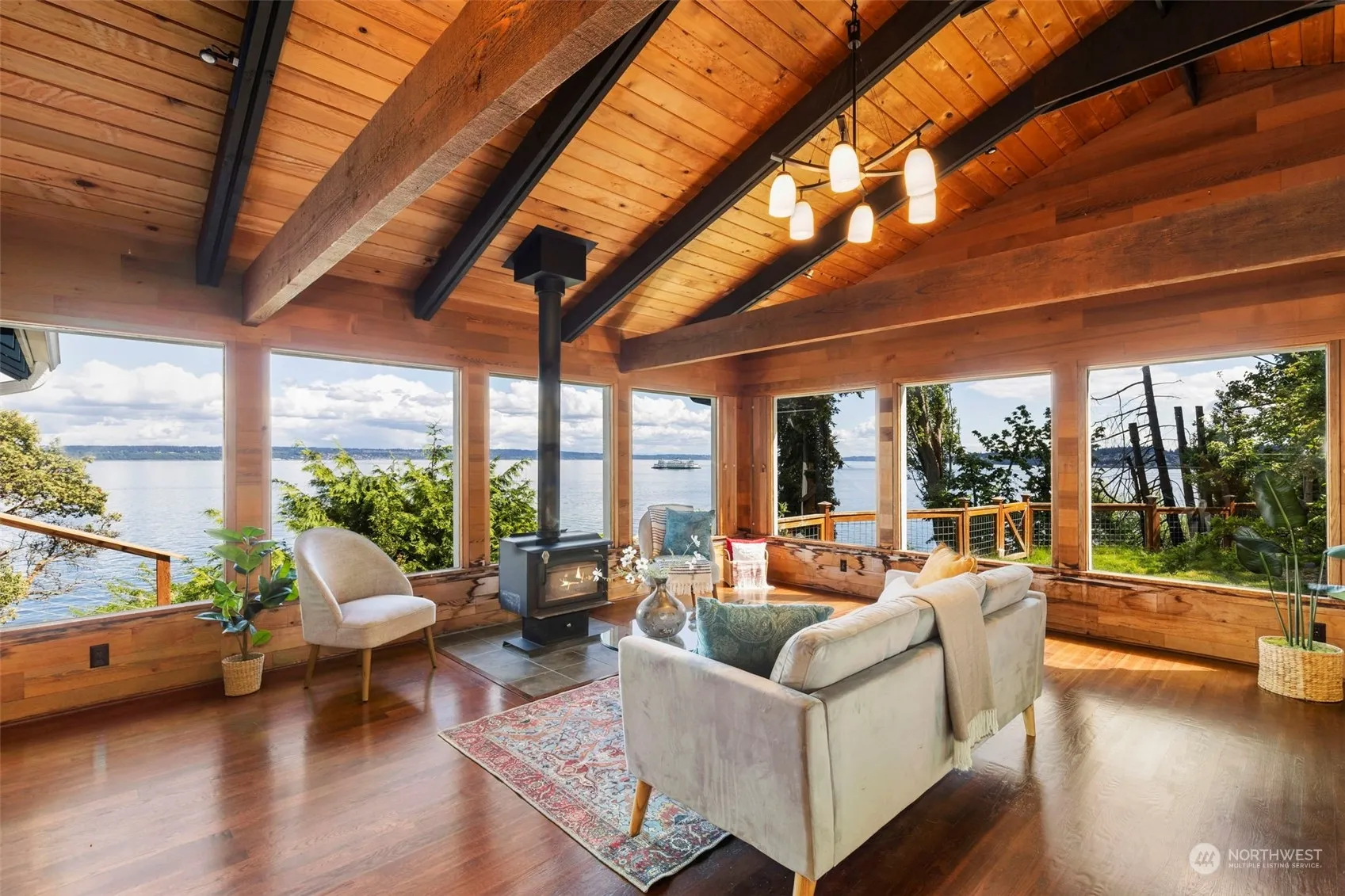Charming Kingston Waterfront Rambler! Imagine waking up each day to stunning views of the Puget Sound, Ferry, Cascade Mountains, & Seattle Skyline. Or wandering down to your 80ft of accessible waterfront to enjoy the sunrise. This property has been renovated in the last 10 years with new hardy plank siding, new roof (2016), new covered deck, new hardwood floors, a remodeled spa-like full bathroom. 940sqft with 2 bedrooms & a full bath (heated tile floors!) in the main house. Vaulted ceilings with large windows, wood-planked walls, & wood stove create a relaxing mountain house feel. 240sqft finished studio is detached and has a living space with vaulted ceilings & extra 3/4 bath. Plenty of off-street parking. Minutes to the Kingston Ferry!