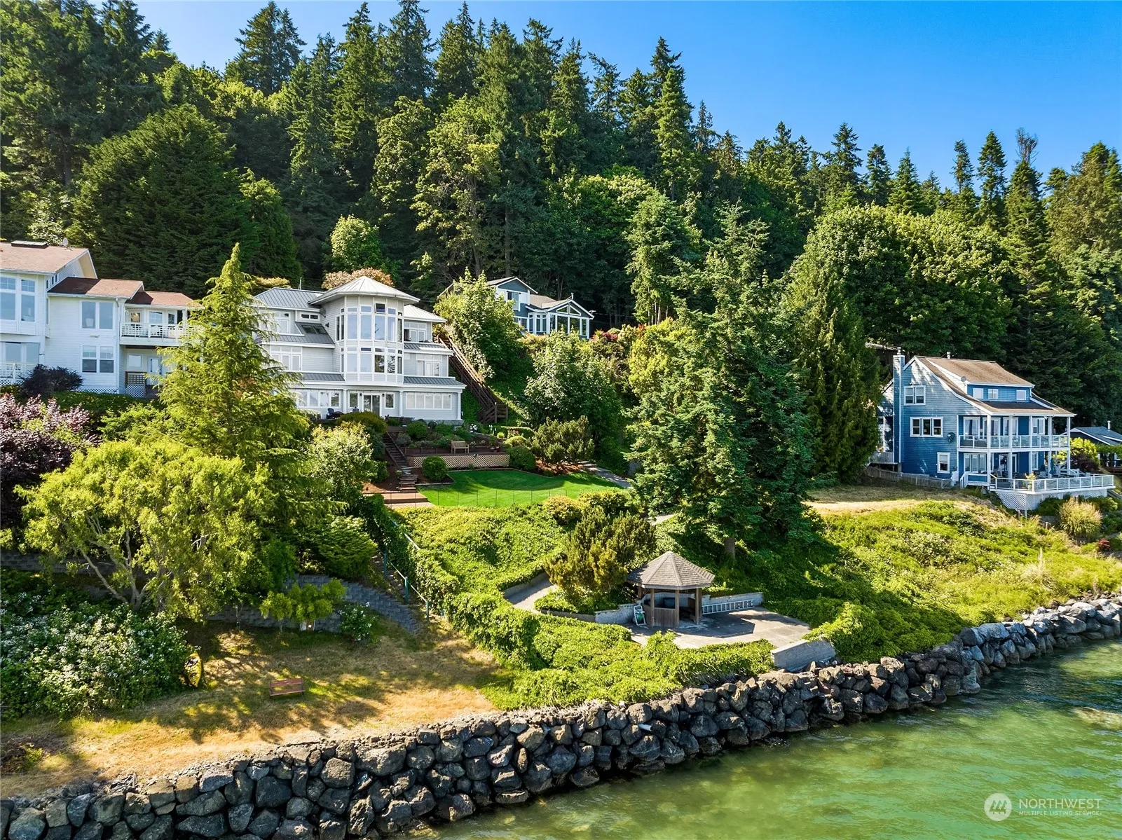 Experience Golden Hour on Washington Blvd through all seasons. Walkable to the Edmonds Ferry and quaint Downtown Kingston, this custom-built home offers Sound views from every room. Enjoy Mt. Rainier from your floor-to-ceiling windows or multiple patios. Watch whales, otters, herons, ospreys, and bald eagles right outside your window. Take in boat traffic, including cruise and cargo ships, regattas, and ferries. Designed for modern living, this home blends private and open spaces with a flexible ground-level space. Recent updates include an updated kitchen with newer appliances + quartz counters, a spa-like primary bath with Sound views, and a 50-year metal roof. The garden features a charming gazebo at the water’s edge. This is the ONE!