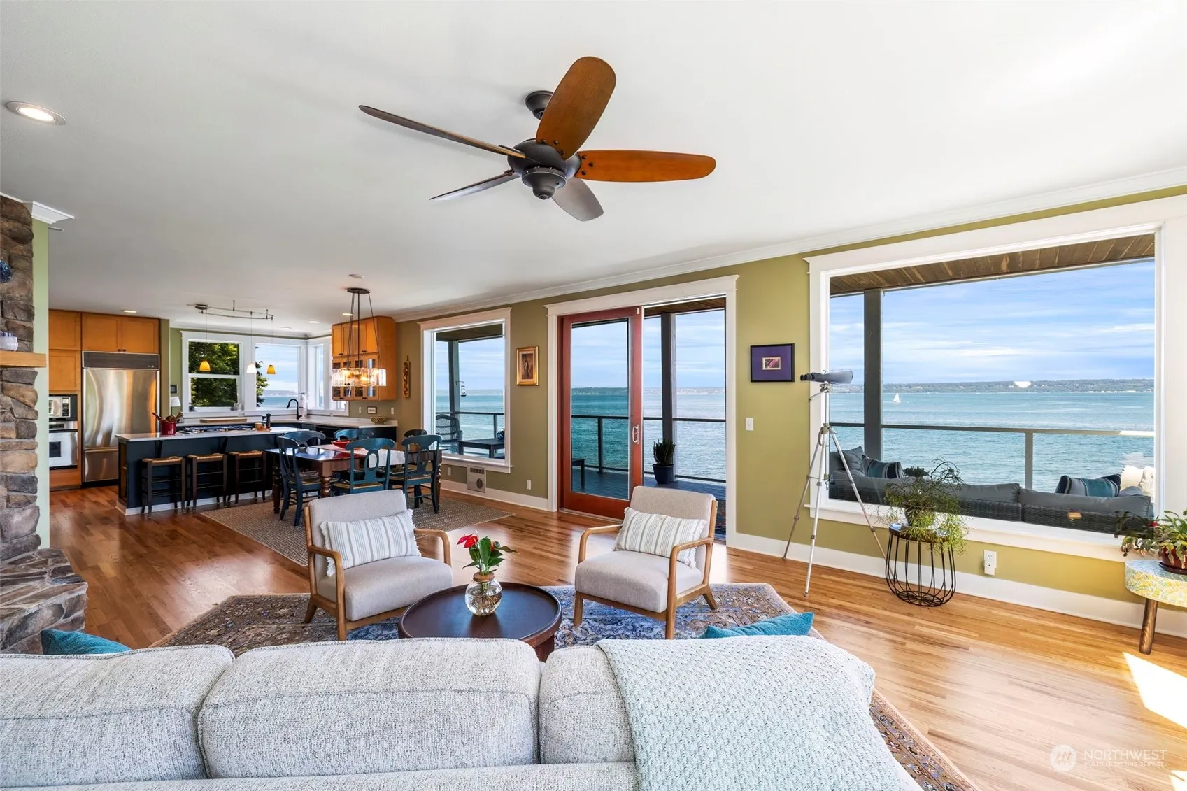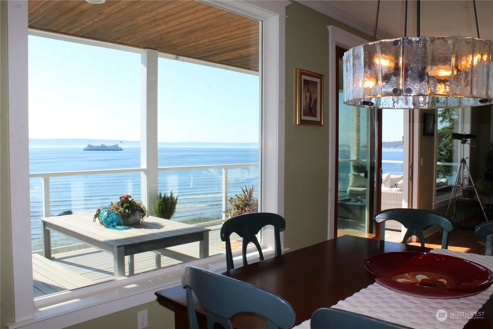 This is a true Kingston unicorn: unparalleled views, a beautiful beach house, walking distance to the ferry & 80 feet of low-bank waterfront access WITH a rare and highly desired bulkhead. Tucked away on a beautiful private road, just long enough to leave stresses behind. With 1600 SqFt of decks & an 800 SqFt bulkhead, this spacious home boasts sweeping views of the Sound, the Cascades, Mt. Rainier, & Seattle. Launch your kayaks easily from the bulkhead or just sit by the firepit for a cozy night “out.” An upper lawn complete with a shed & fenced garden offers plenty of green thumb space. Newly refinished hardwood floors, kitchen and bathrooms, and updated interior woodwork elevate this home’s bold elegance. The theme here: quiet luxury.