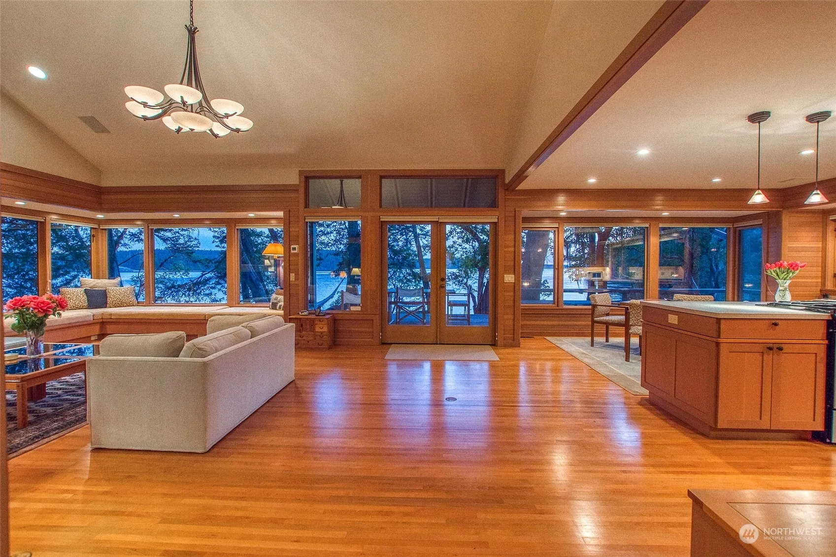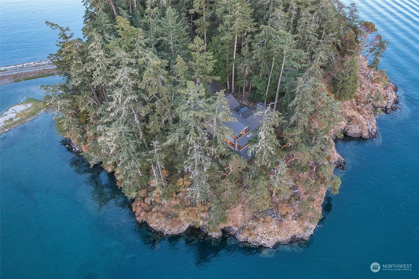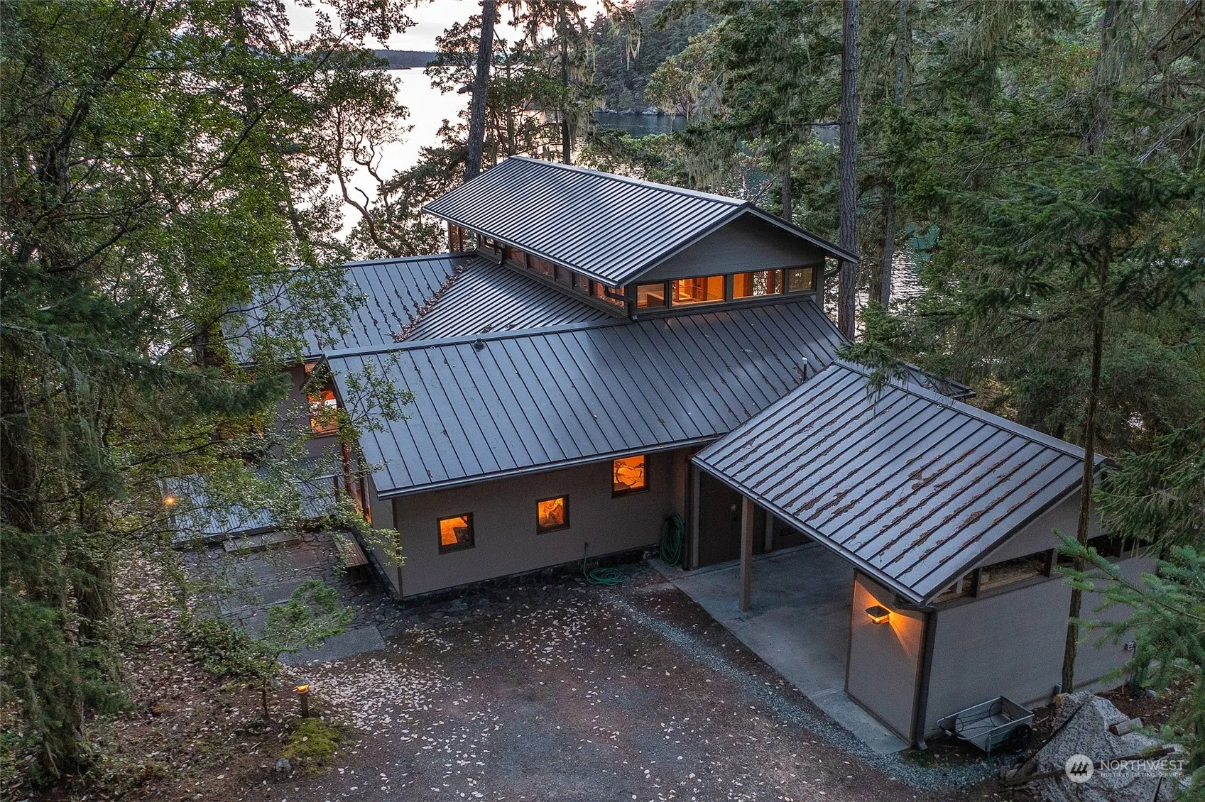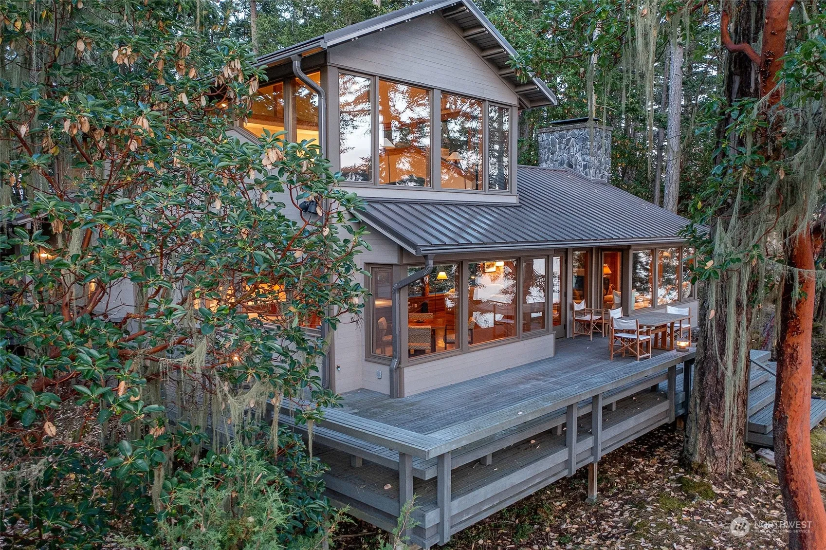 The convenience of a land bridge and the feeling of a private island w/ 360′ views from Harney Pt., this NW Contemporary 2282 sf 3 bedrm/3 bath is sited on 14+ acres offering wooded uplands, a double cove beach/community dock and estuary (shared), and a private 4 acre “island”. Wander paths to vistas and coves and discover the variety of flora and views in this unique setting. Arrive to your private mooring buoy and come ashore to the low bank beach or shared day use dock. Designed by Hoshide Williams Architects in 1995 as a vacation home for extended family, the main level has an open concept great room/kitchen with sunset views, a bedroom with ensuite bath plus a bunk room & full bath. Upstairs is dedicated to the spacious primary suite.