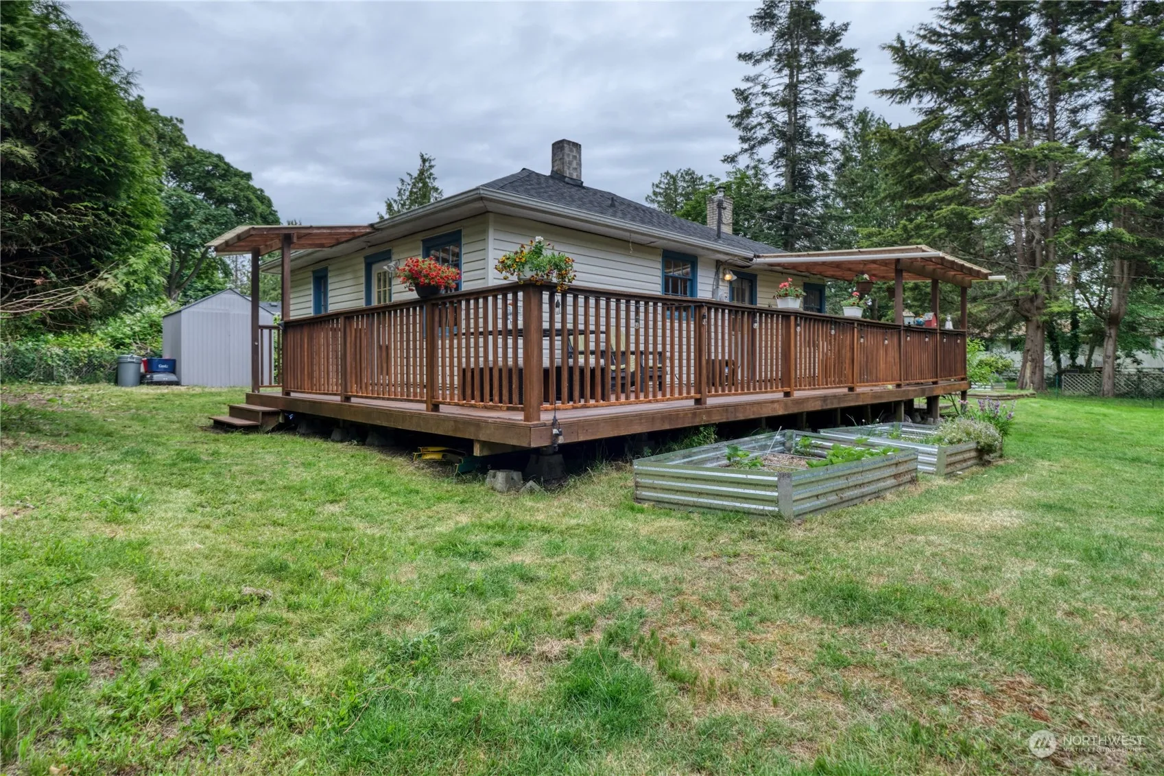 Hard to find South Beach location with a LARGE LOT with 85 ft of frontage PLUS deeded beach access! Quiet dead end road with lots of sun! Lovingly restored and renovated with a beach rock fireplace, near new roof, easy care vinyl siding, concrete block foundation, original wood floors, and very bright with large corner windows. Massive wrap around deck with exotic hardwood decking/railing and partially covered to enjoy anytime of the year. Great OPEN floor plan offers 2 bedrooms PLUS a flex room for extra guests or office or formal dining room. Nicely landscaped and private, outdoor firepit plus outbuildings for storage. Some furniture is negotiable. As quiet and private as it gets and short stroll too the beach!