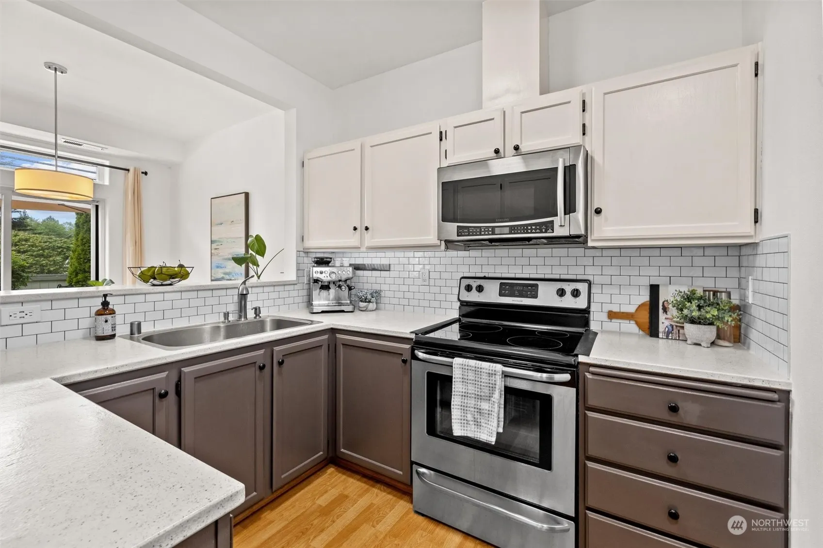 Beautiful completely renovated 3 bed, 2.5 bath Edmonds townhouse in convenient location. The lovely updated kitchen has newer refrigerator & dishwasher, extra large sink and is open concept! Enjoy the large windows while cozying up to your updated gas fireplace, gazing out on the back patio w/space for a garden. The upstairs boasts new carpet, 2 renovated full baths, 3 beds & new washer dryer within the last 2 years. The huge primary suite allows for a sitting area or office space, boasts of a walk in closet & full bath. Storage abounds throughout this home which has attached, one car garage, & parking in front of garage. Close to frways, bus lines & mall. Well run HOA, no rental cap, cats/dogs with restrictions, 3 guest spots avail.