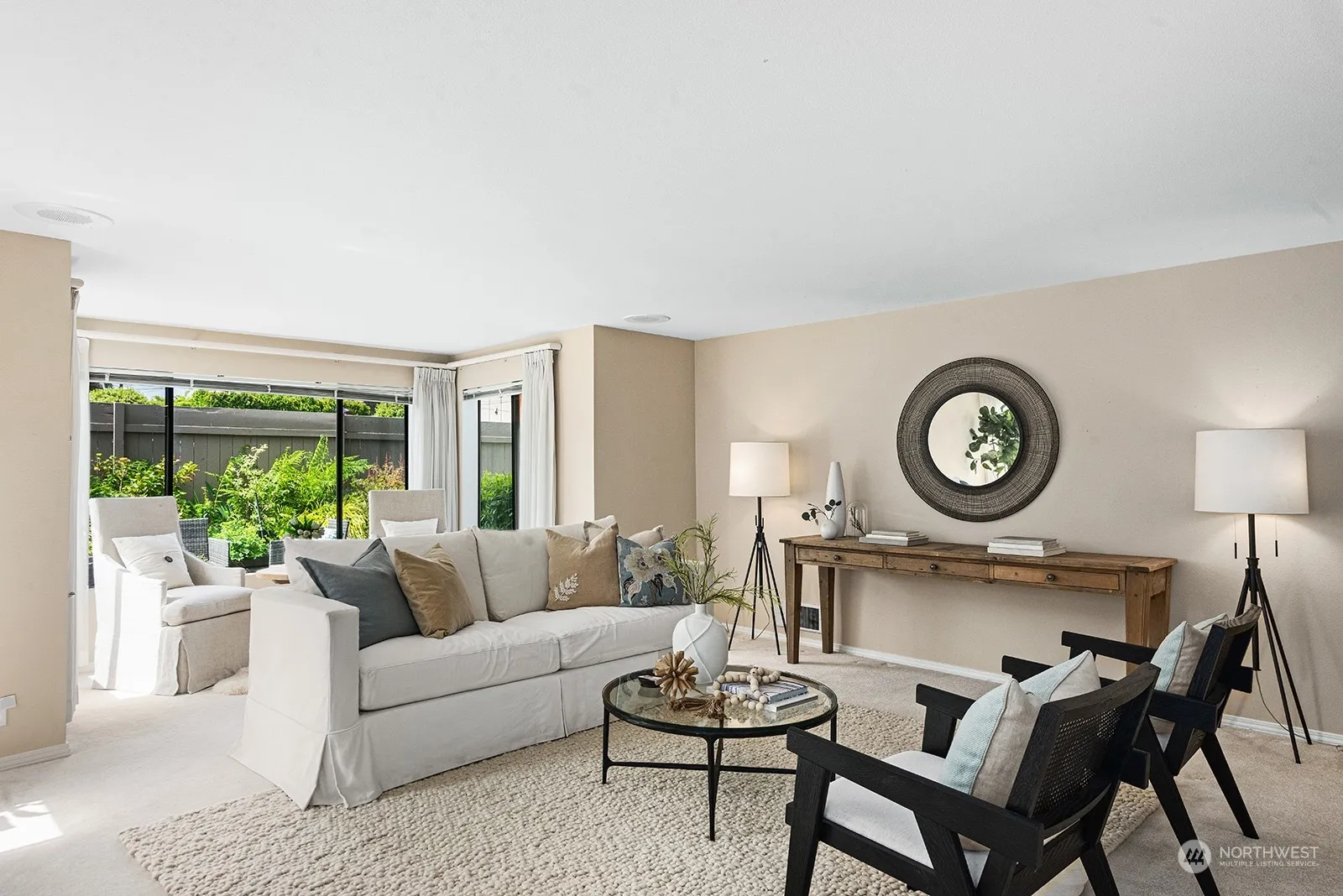 Nestled in the coveted Edmonds Bowl, this rare ground floor, one-level Home is just steps away from vibrant Main Street & the Waterfront. Southeast Corner with an abundance of space & natural light plus your own private wrap-around Patio with Garden space. Generous Primary suite has private Bath & Walk-in Closet. Open Kitchen, formal Dining Room, and spacious Living Room. Large, walk-in Utility room with full-sized W/D, plus cabinet & Pantry storage. Two Garage parking spaces with easy access to the unit from new Elevator. Building has community Rec Room, small Gym, and formal Lobby with secured entry. Ample storage in the Unit, above the parking spaces, and in the deeded Storage closet in the Hallway. Easy stroll to Beaches & Ferry.