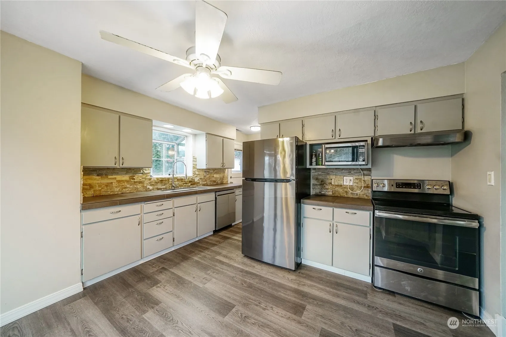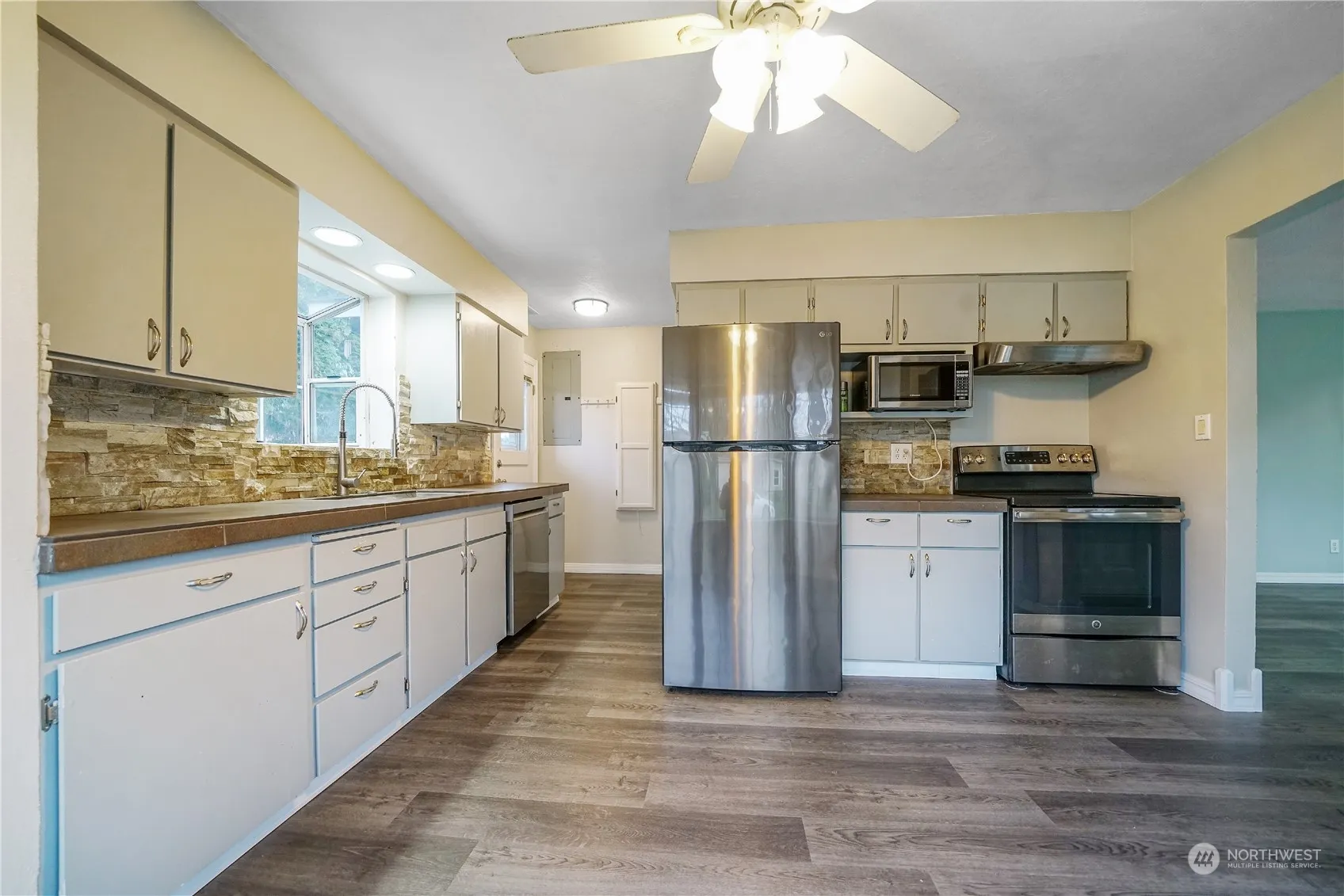 Functional 3 bedroom, 2 bath Olympic neighborhood home. Roof was replaced 6 years ago. Replaced all of the 1946 water and drain lines 5 years ago. Primary bedroom and bath were early 2000’s addition. Concrete underground drainline in great condition. All new appliances besides refrig, range, microwave. Furnace has new variable blow motor. Heat pump has new accumulator, muffler w/ recharged freon, compressor replaced 4 years ago. Hardi plank siding, fully fenced backyard w/ 2 side gates, nest thermostat, ring floodlight camera, workshop, detached 1 car garage w/ storage room and 1 carport stall w/ ambient lighting. Primary bth walk in shower, jetted tub, tile flooring in bathrms. Many updates. Prime location a block away from Lake Sacajewea