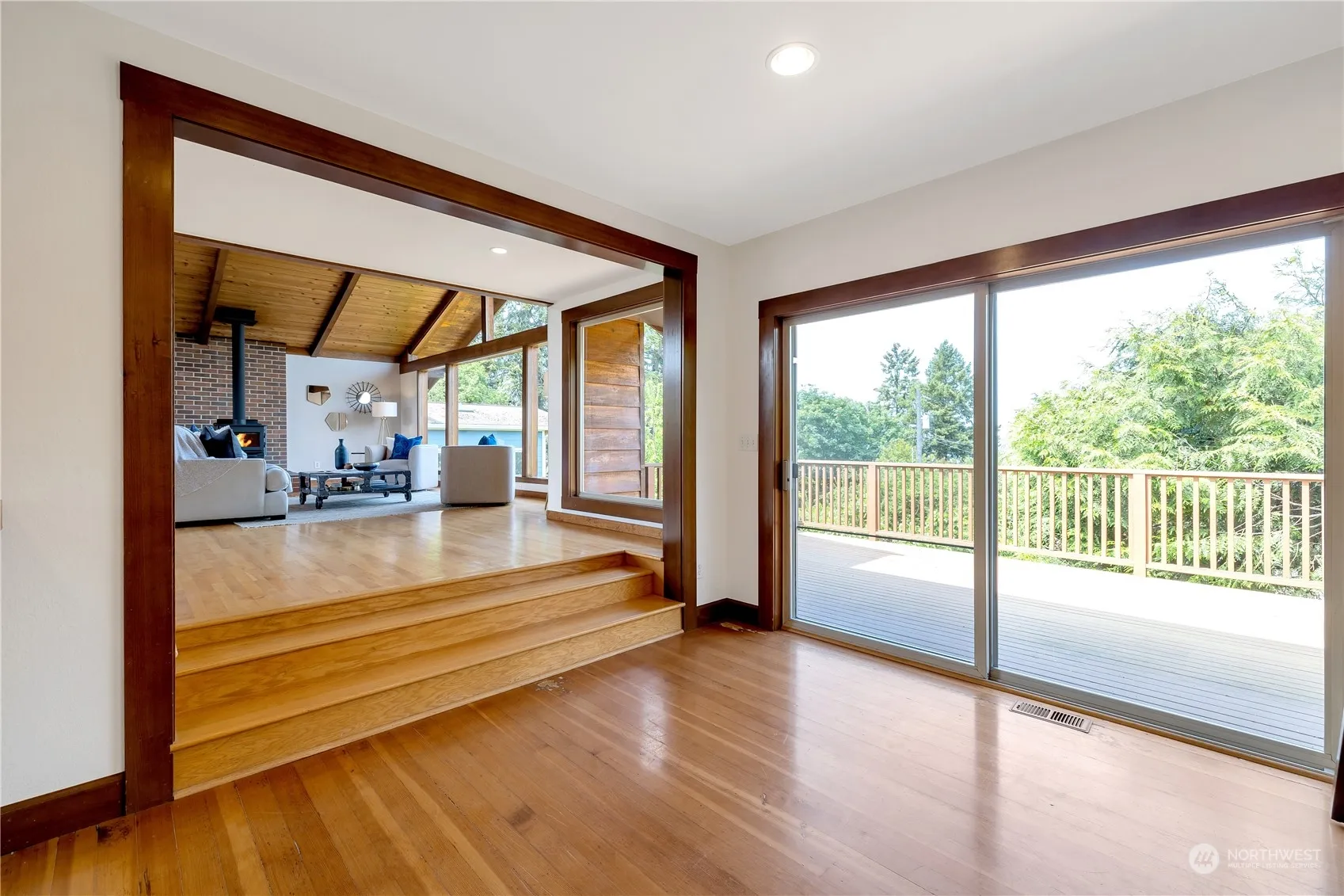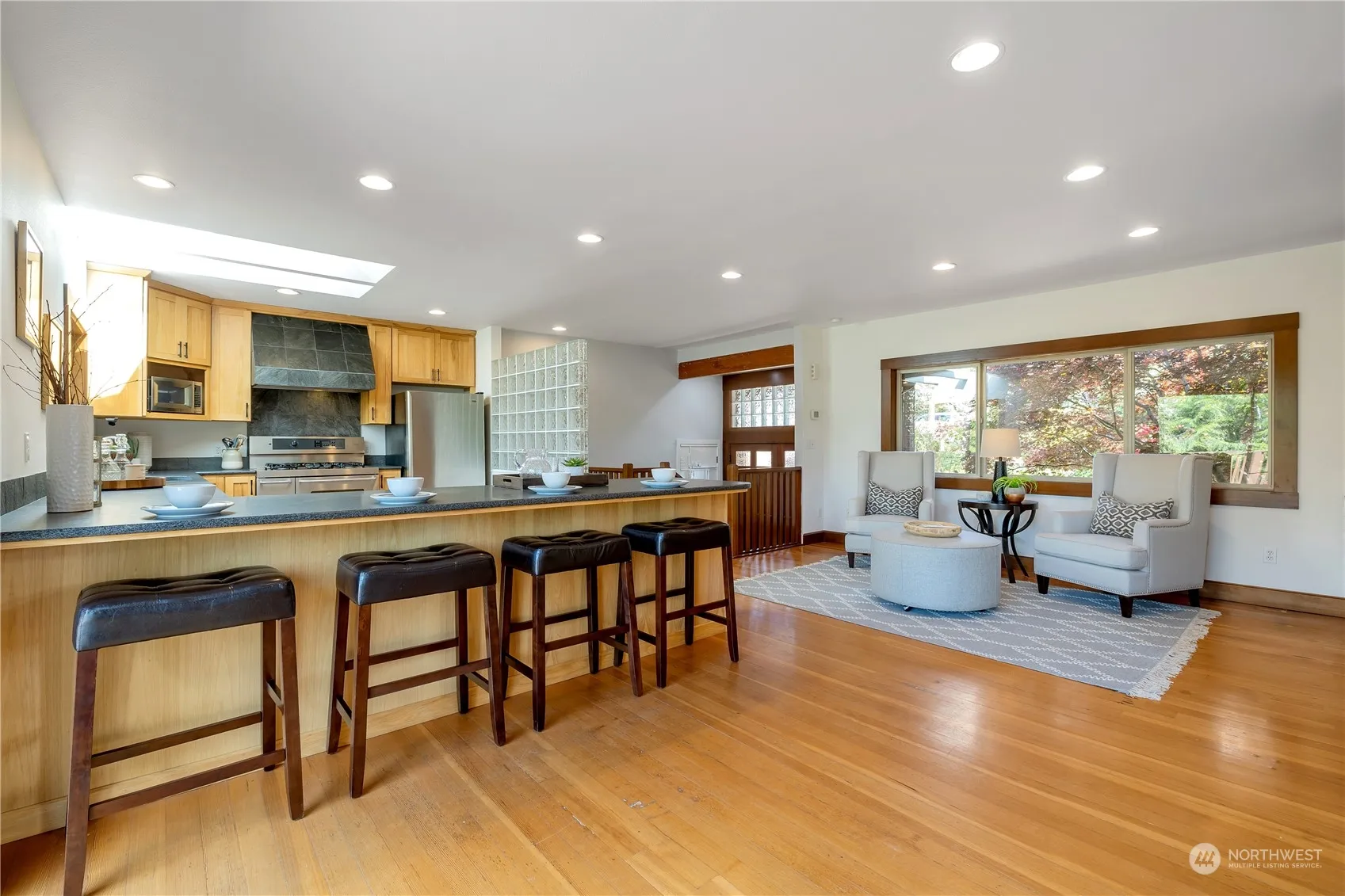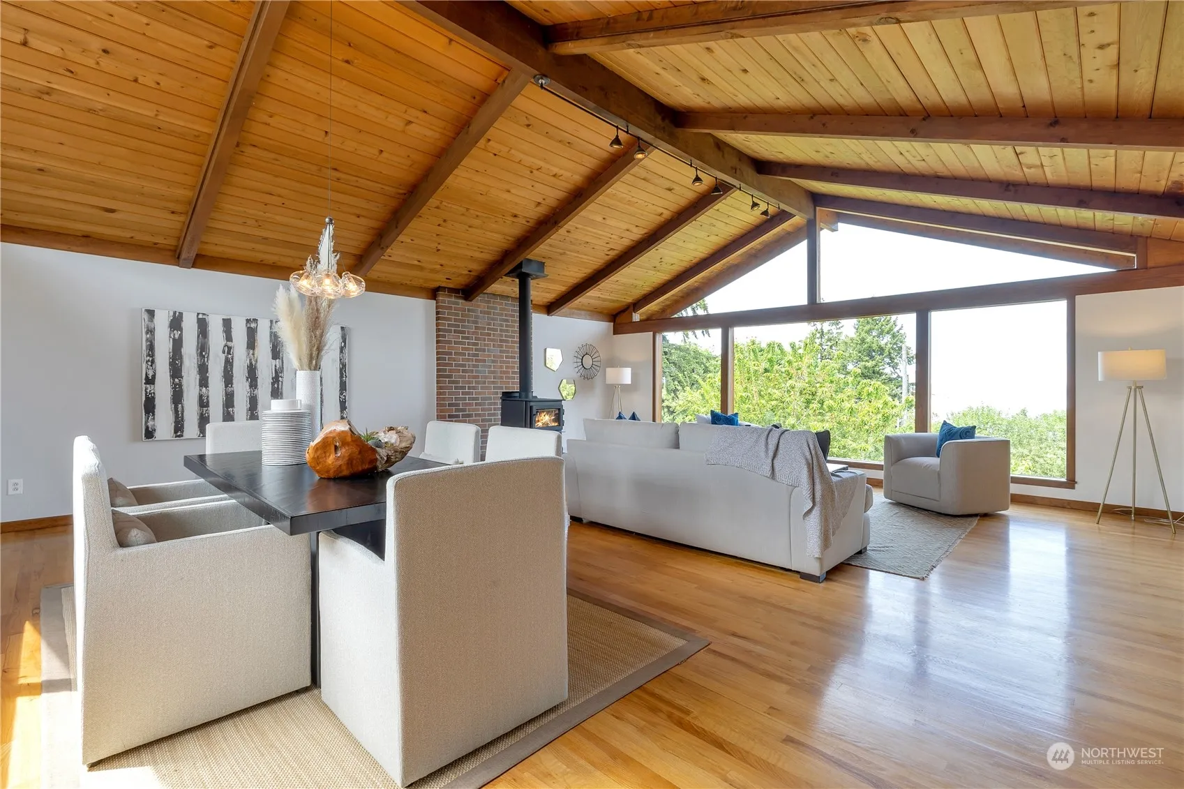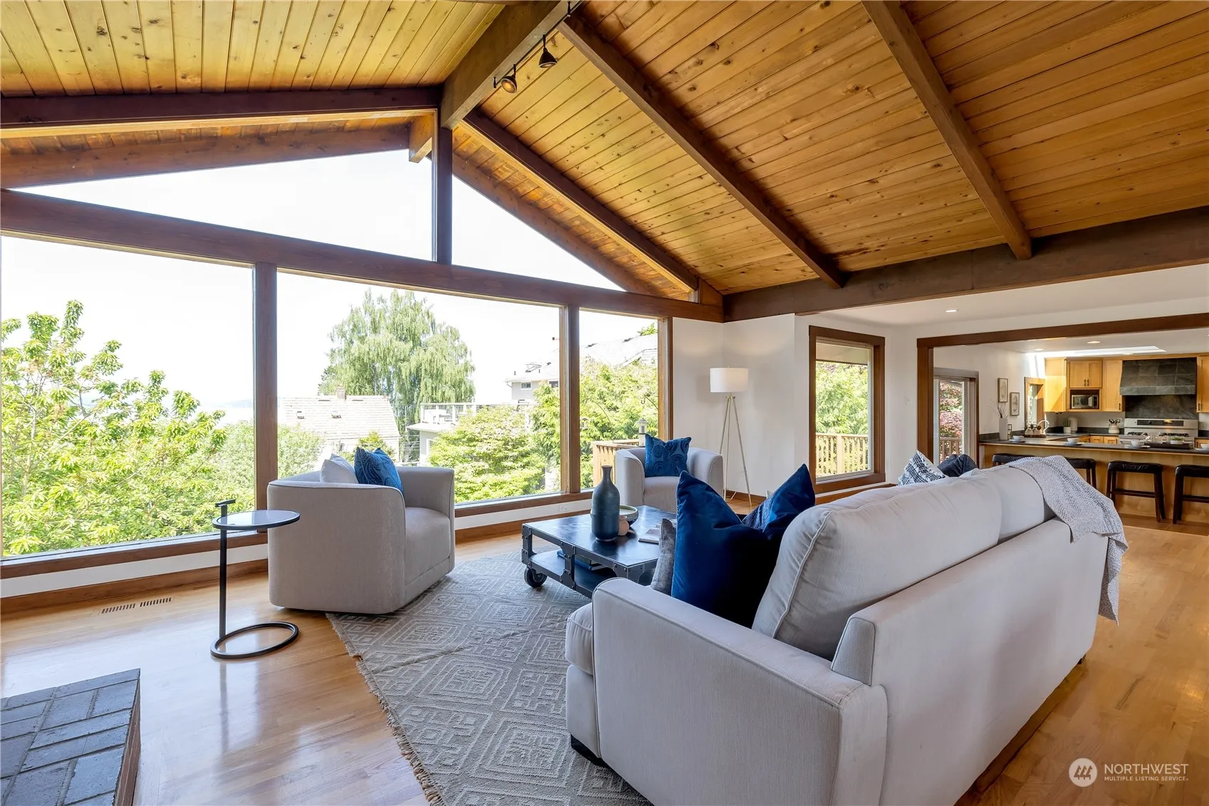 Assumable 2.25% loan! This beautiful contemporary home offers PRIVACY. It’s mature, varied & colorful landscaping creates your own secluded paradise. Enjoy the stone patios, terraces, waterfall, & hot tub within the hedges and umbrellas of evergreen trees on its 7800 sf corner lot.. Home is spacious & bright; sleek, but warm. Floor plan is designed for entertaining, w/lots of open spaces, view deck, floor to ceiling windows. Large kitchen equipped w/professional SS duel-fuel, dbl oven, 6 burner range, deep sink & miles of granite counters. LR offers water view, open beam vaulted ceiling. Oversized 2 car garage w/shop space, work benches + office space w/walk-in door. drive oat or RV parking, too. 4 blocks to waterfront.