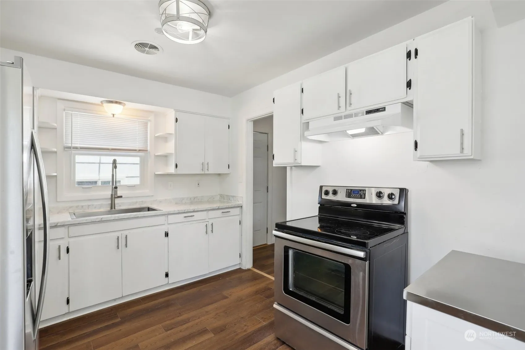 Sweet & Cozy Bungalow just waiting for new owners! This home has MANY upgrades and tastefully remodeled from top to bottom! 391 additional square footage in garage area for office/bonus/ADU? 2 rooms down with a full bath plus to additional rooms up stairs. New paint, LVP, tankless water heater, all new fixtures, mini split. New electrical panel updated plumbing, lifetime shingle metal roof (home). Newer fencing all new doors throughout, 3 pane Penguin windows, new switches and plugs, new blinds throughout, new counter top in kitchen & undermount sink with new faucet, new vanity in bath. Garage door opener with Alexa for those deliveries when you are not home! Upstairs room has a secret cubby with electricity for play room or extra storage.