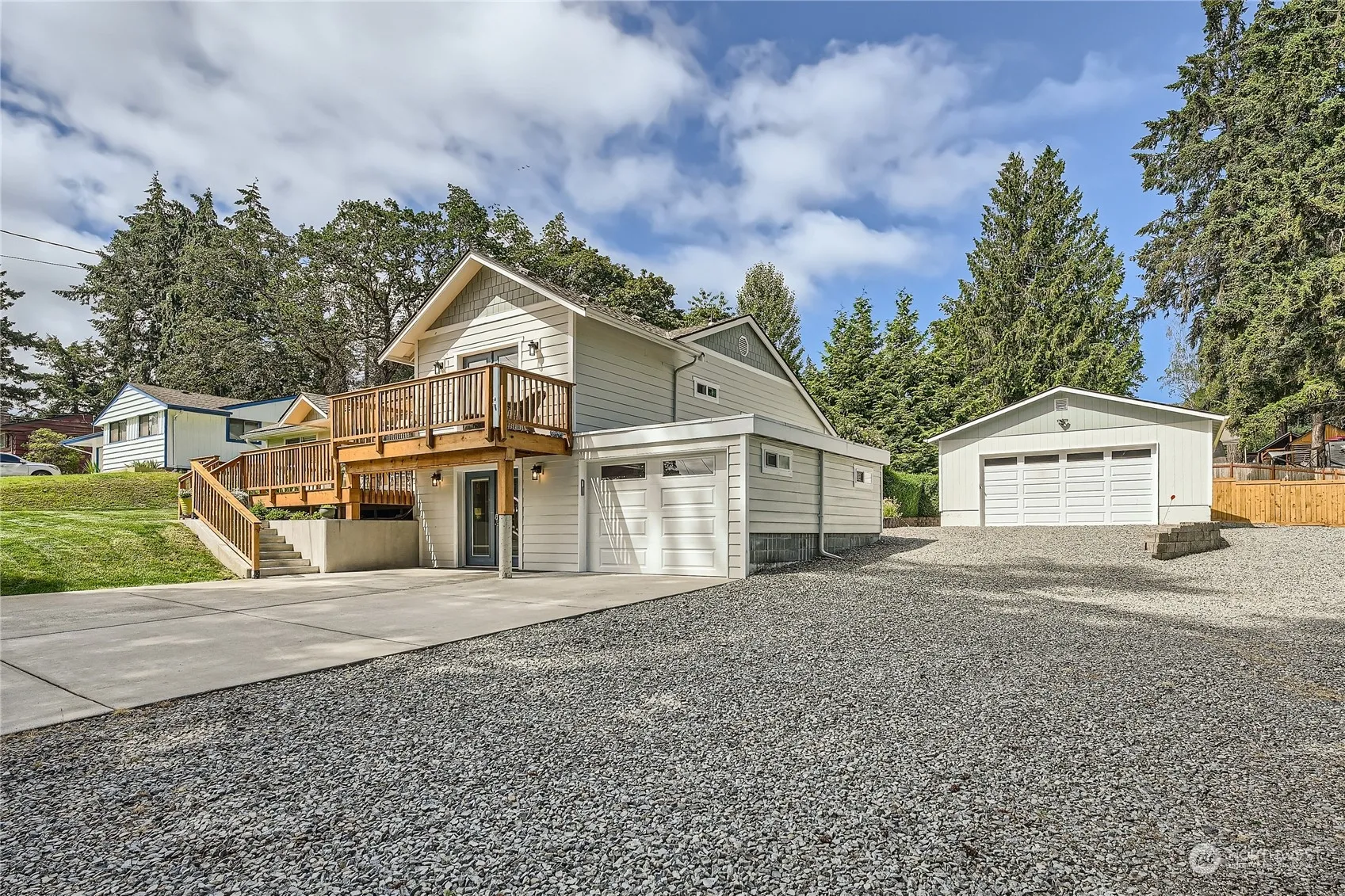 This fully remodeled Lake Steilacoom home is a true gem! Restored original hardwood floors in living room and main floor bedrooms. Boasting a new roof, windows, AC, electrical, and a tankless water heater in 2022, this home offers comfort and modern convenience. Thoughtfully upgraded with a blend of style and function. Outside features a large detached two car garage, attached one car garage, and a fully fenced back yard complete with a shed for your garden tools. The light and airy primary bedroom offers a private balcony with views of the lake and Mt. Rainier. Downstairs, the bonus room can be transformed into an additional bedroom or a family room with its own entrance. Don’t miss the opportunity to own this beautifully updated home.