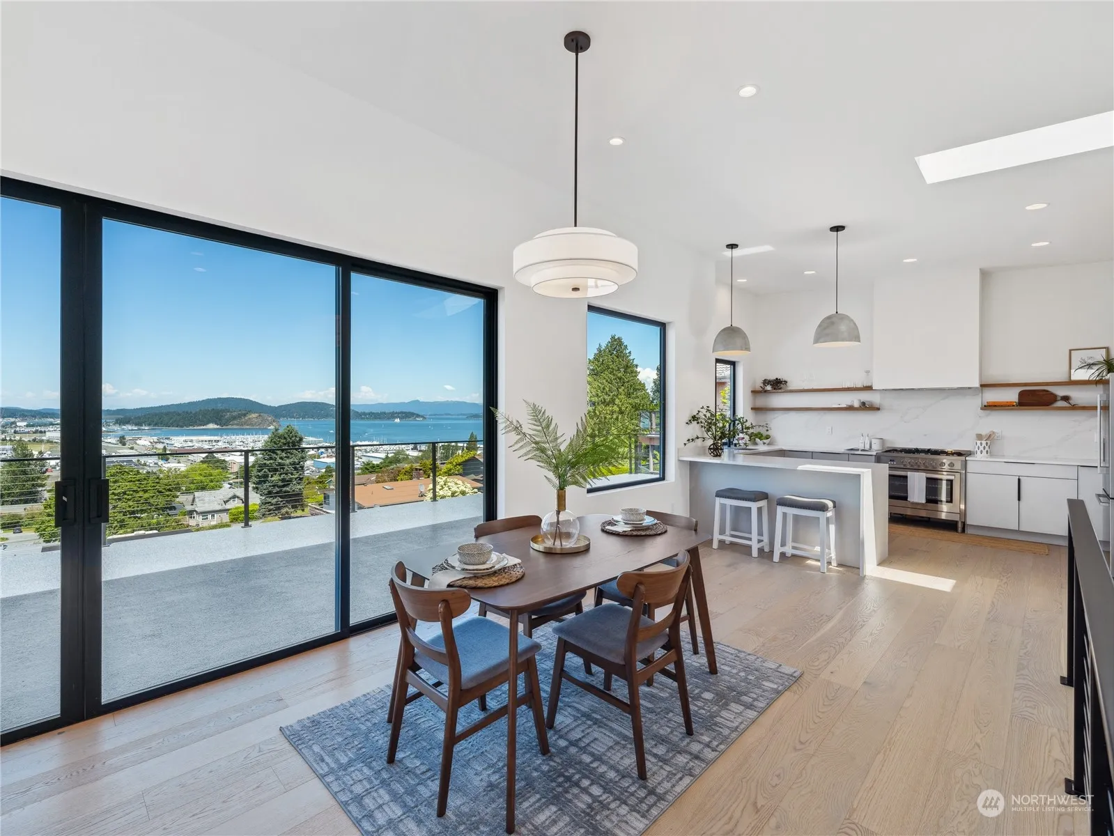 Enjoy prime in-town living and unmatched water views of Fidalgo Bay, Cap Sante Marina, and downtown Anacortes! This remarkable home features a 1,000 sq ft deck for indoor-outdoor living, panoramic windows, vaulted ceilings, on a dead end road. The beautiful ensuite boasts exquisite finishes, creating a spa-like sanctuary and the primary closet includes a washer/dryer for convenient single-story living. Downstairs, you’ll find a secondary kitchenette and a covered patio for year-round entertainment. The oversized lot offers space for a potential shop or ADU. Don’t miss the large workshop with backyard access, perfect for any hobby or project! Truly rare to find a fully renovated home, located in town, with water views, on a large lot!