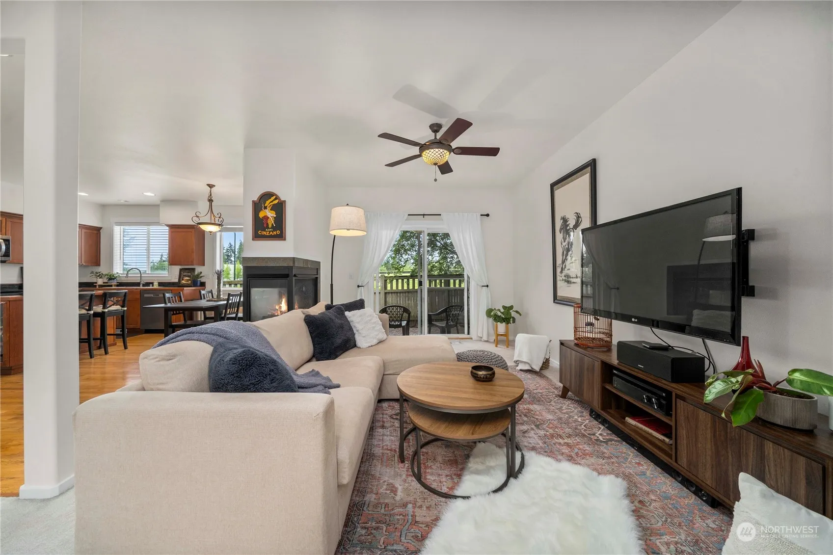 Discover an impressive Curtis Lang resale with soaring ceilings & a functional floorplan. Relax in the spacious living room with a dual-sided fireplace. The expansive chef’s kitchen features ample cabinetry, counter space, walk in pantry. The open concept layout is perfect for entertaining. Upstairs, the primary bedroom boasts an en-suite & walk-in closet. Additional highlights include a loft area, a sizable second bedroom, and a full bath. Recent updates include fresh paint, new roof, gutters, and exterior paint. Enjoy a two-car garage, private patio, and proximity to coffee shops, cafes, and schools. HOA dues cover landscaping, window washing and exterior improvements. Ring doorbell and SMART Thermostat. Pre-inspected and move in ready!