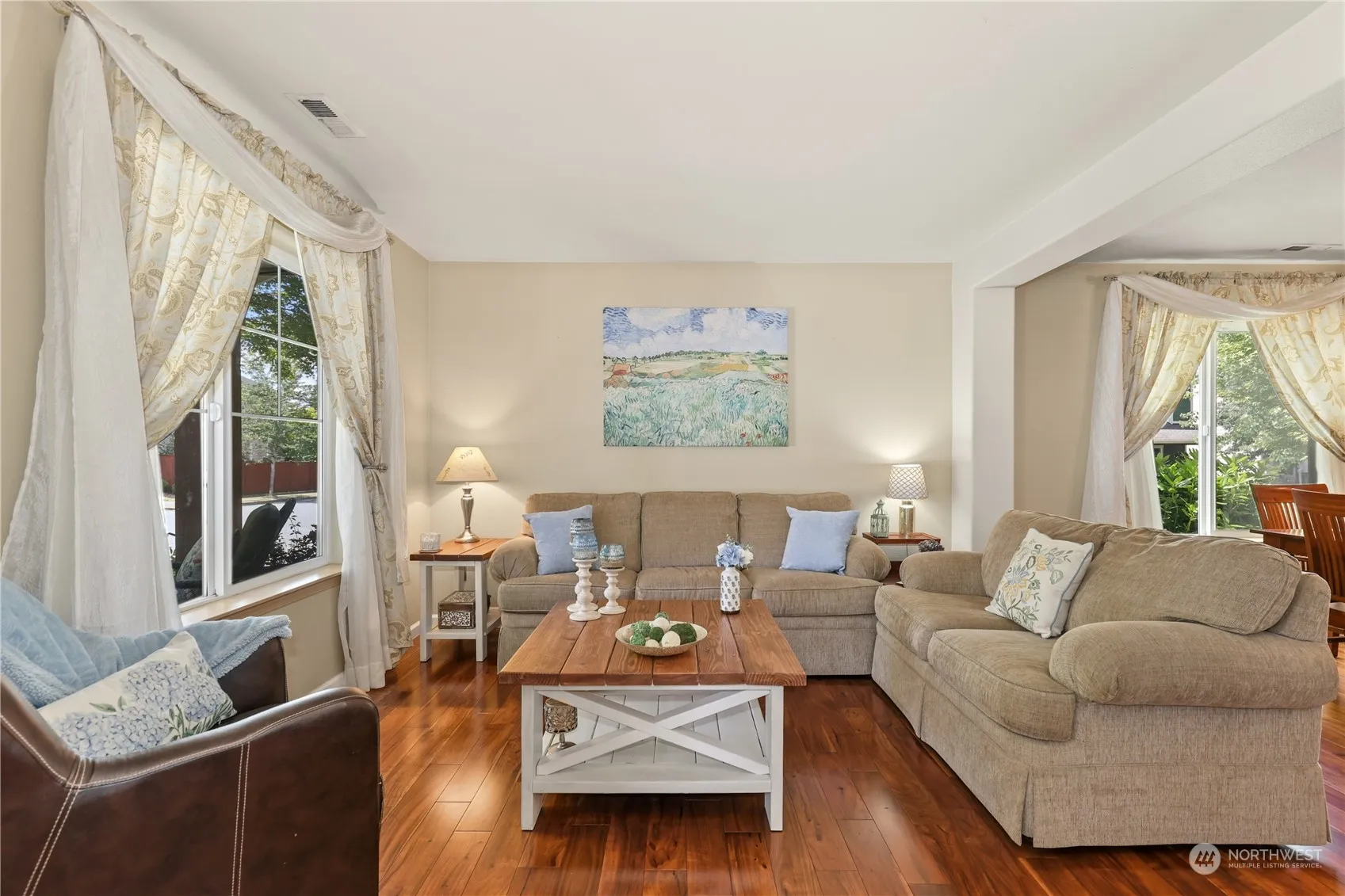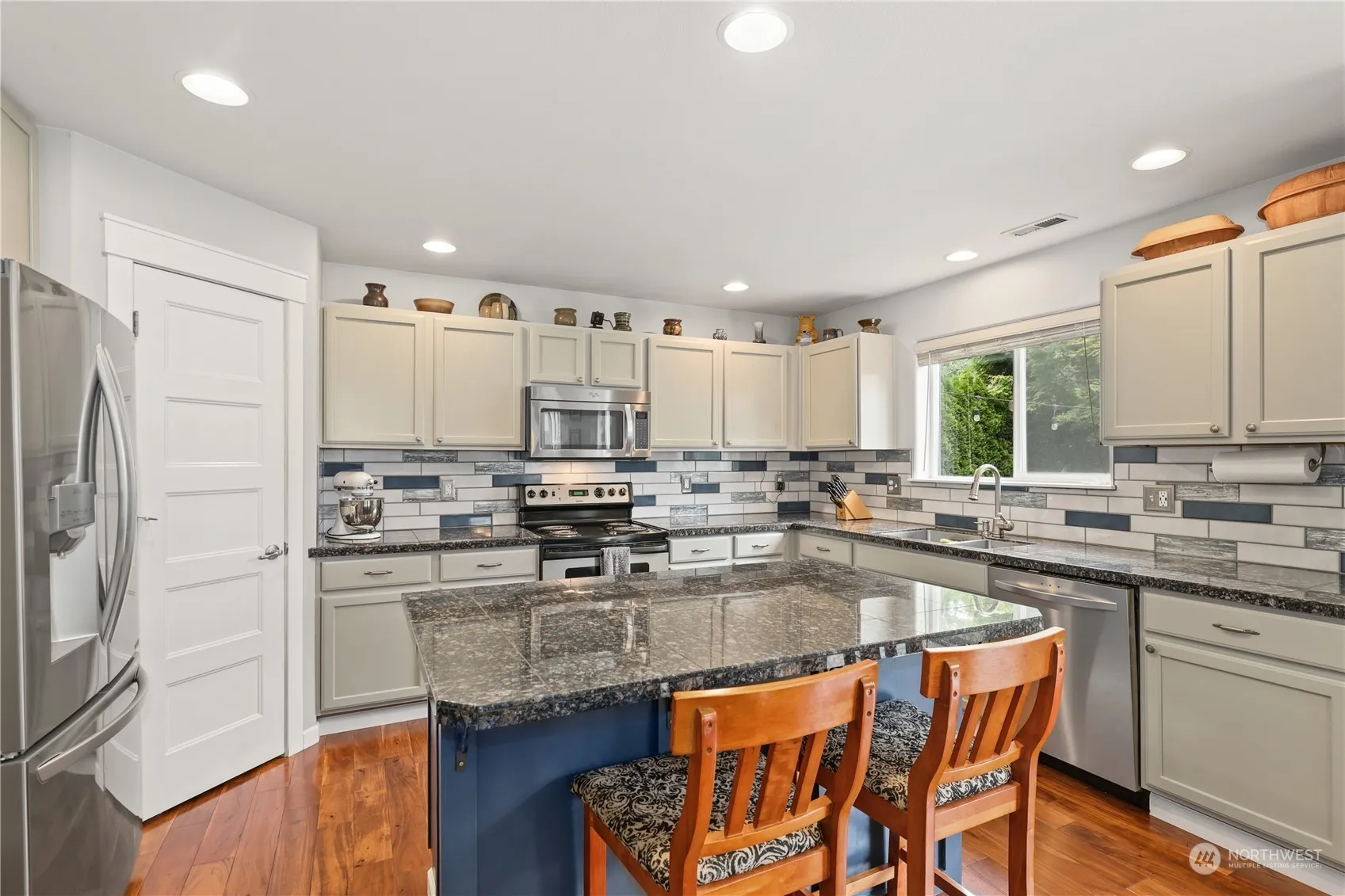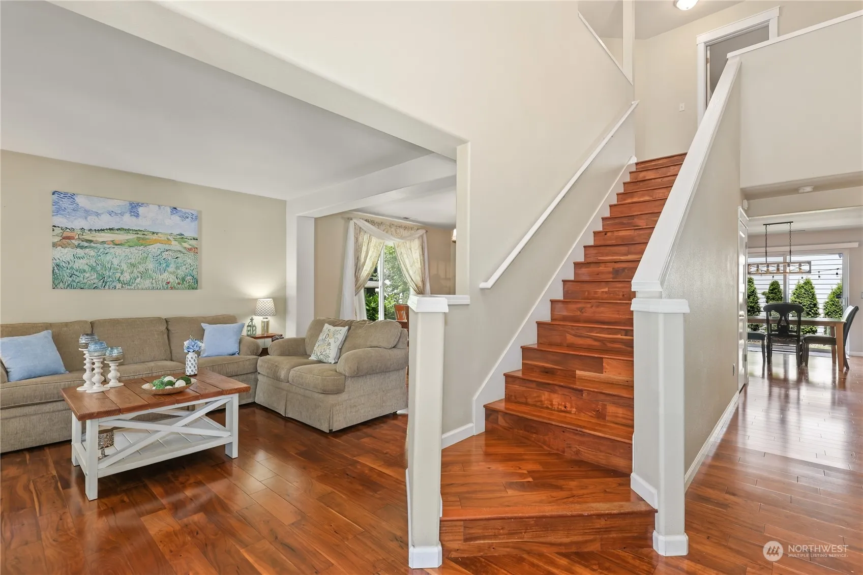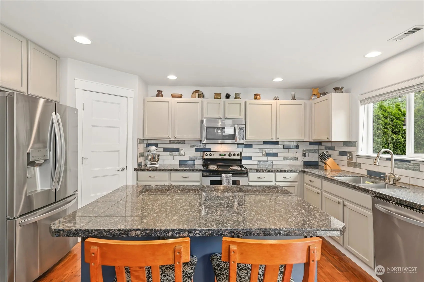 Pride of ownership shows in this one. Spacious entry with high ceilings & gleaming Acacia HW flr welcome you as you enter & flows smoothly into a large living & dining space. Continue into your updated kitchen with SS appliances, granite counters, tile backsplash & island. Kitchen opens into your family rm with warm FP & sliders to your patio. Back yard fully fenced with mature landscaping & sprinkler system. The 2nd floor leads up to your primary BR with 5 piece ensuite bath, updated shower, heated floors, & cabinets. Your loft is a perfect spot for a WFH office or art space. Hallway bath has updated tile floors and counters. Furnace & heat pump 8 yrs old, water tank 2 yrs old and new roof. Short walk at end of alley to community park.