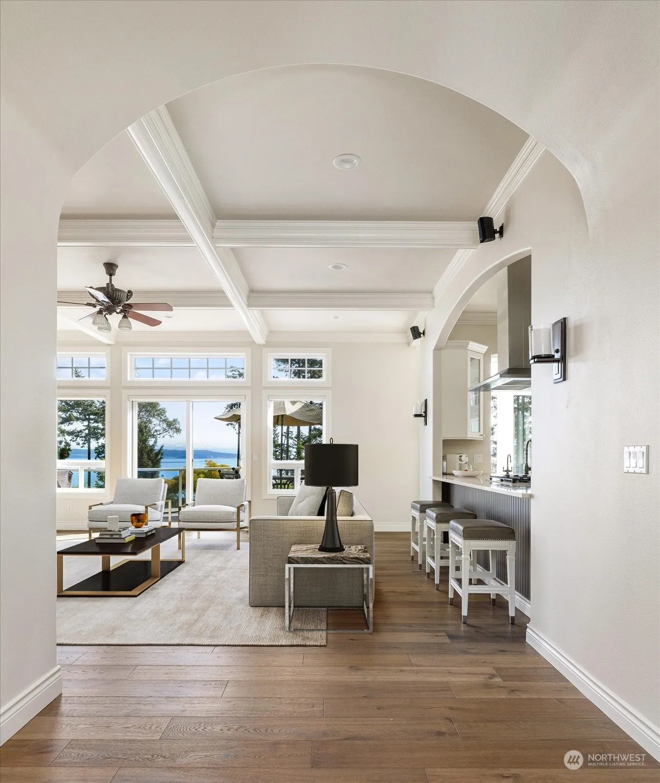 Where luxury meets tranquility. Wake to breathtaking views of vibrant gardens and sparkling blue water to enjoy the sunrise behind Mt Baker. The freshly re-imagined open plan captures stunning views with walls of windows. Tasteful modern design features: a soaring double-sided travertine fireplace, bespoke cabinets and counters, top-of-the-line appliances, a primary suite with luxe shower and tub, and the best laundry room ever. The incomparable gardens are a botanical masterpiece, boasting a profusion of flowers, maples and fruit trees, an artist studio, totem pole, entertaining areas, plus a stone fireplace. The lower level, with a separate entry, offers the flexibility of a 2-3 BR apartment, ideal for guests or multigenerational living.