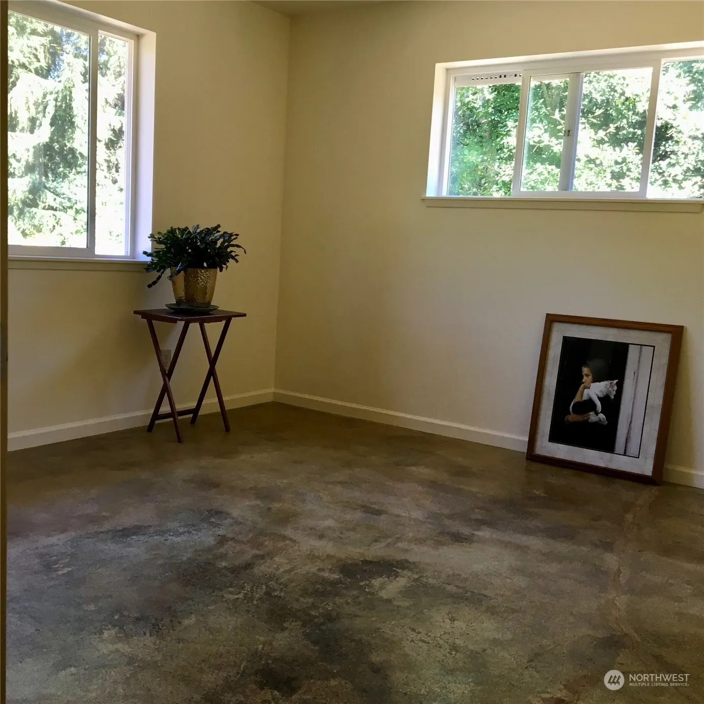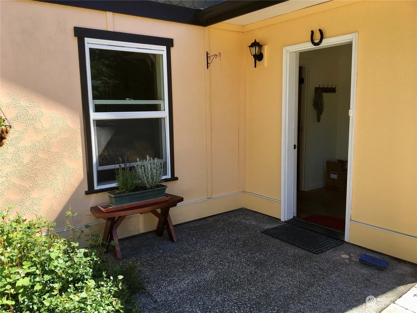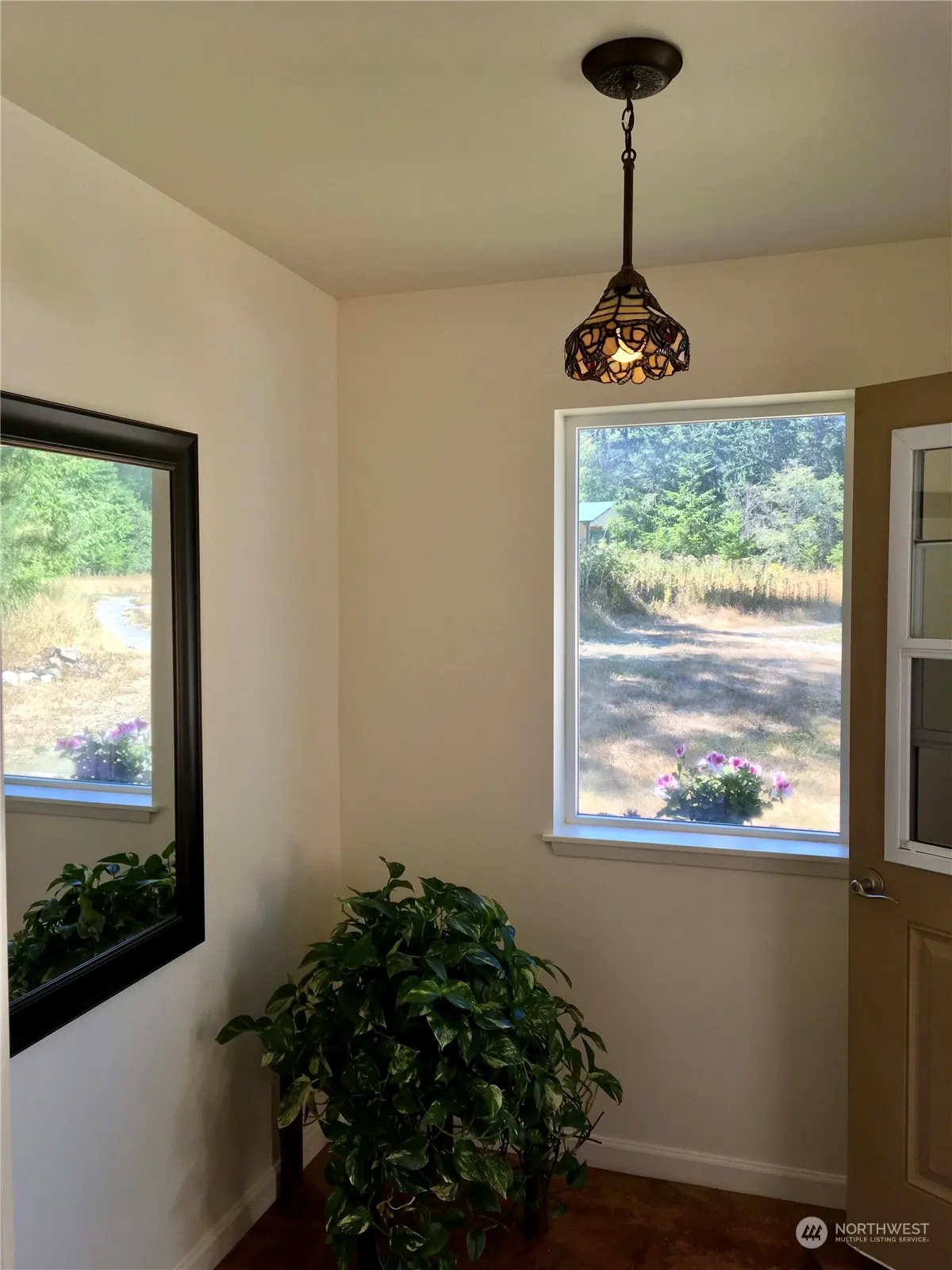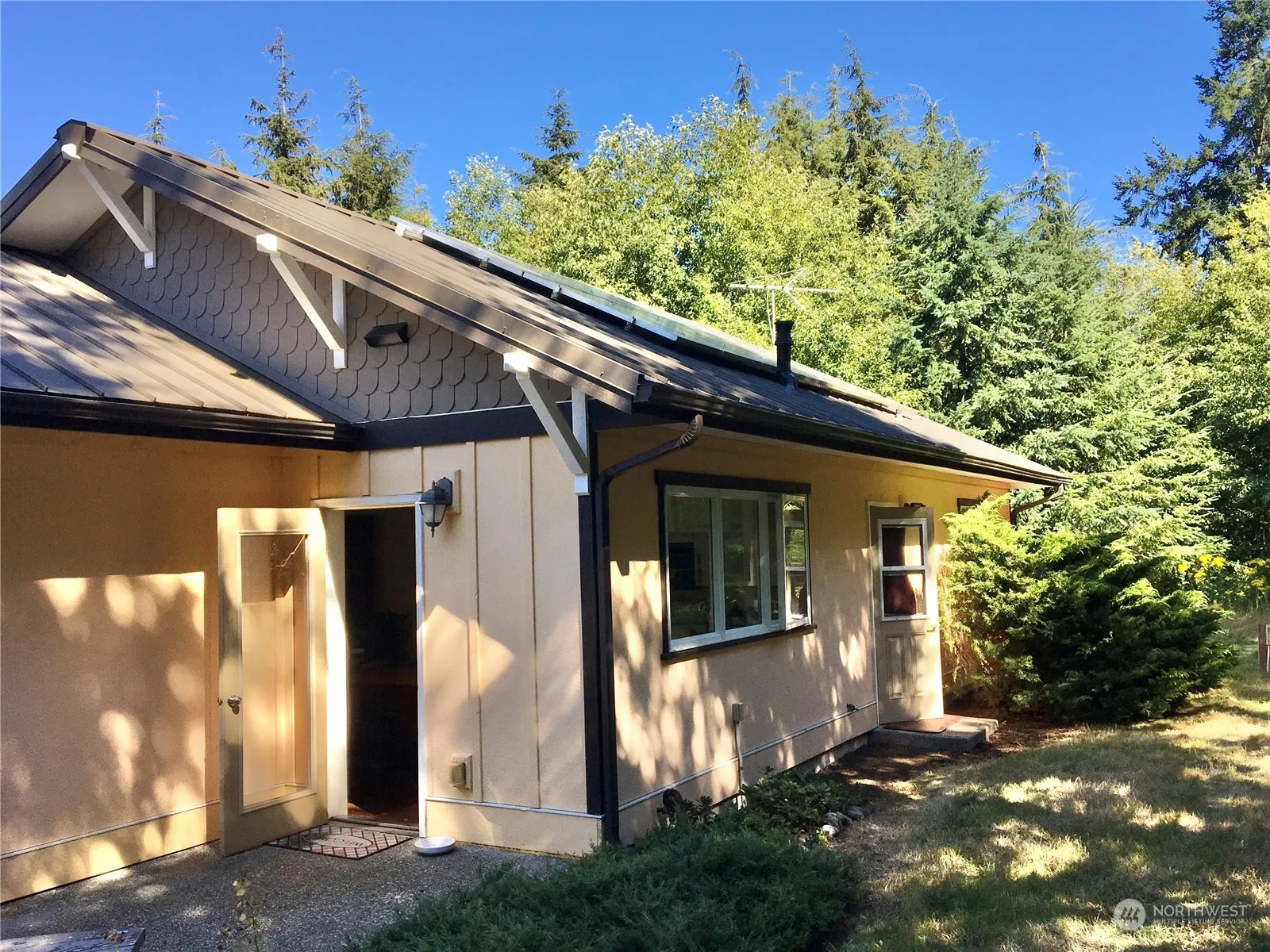 Very clean and private cozy custom built home. Five acres at the end of road. In jet noise zone. Solar panels. In floor heating. Natural setting. Custom built. Pocket doors to separate kitchen from living room. Water softening system. Bathroom is European split design-1)shower/sink is one room, 2)toilet/sink/laundry room. Room with toilet/washer and dryer has an exit door. Freshly painted and clean!