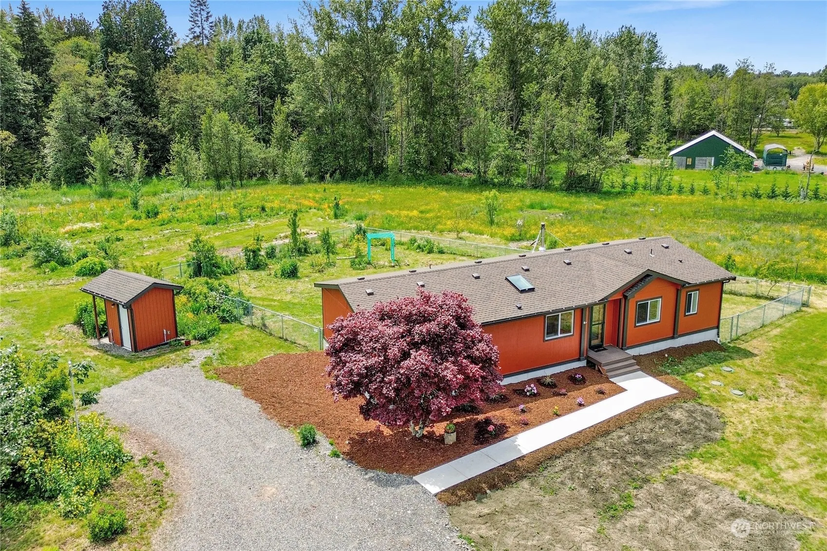 The gorgeous acreage you’ve been waiting for is here! Located on a flat, cleared, shy-5-acre parcel, this beautifully updated 3-bed/2-bath home combines modern appeal with rural charm into one unique experience. Tree-lined driveway leads you to a cute single-level home with open layout, sunny kitchen with island + stainless steel appliances, and spacious primary suite with 3/4 bath and sauna! Recent updates include roof, deck, interior + exterior paint, carpet, concrete foundation skirting, and power to the 36′ x 36′ barn with loft and 3 stalls. Featuring garden space, fruit trees, and equestrian possibilities, there’s something for everyone. Your piece of paradise awaits!