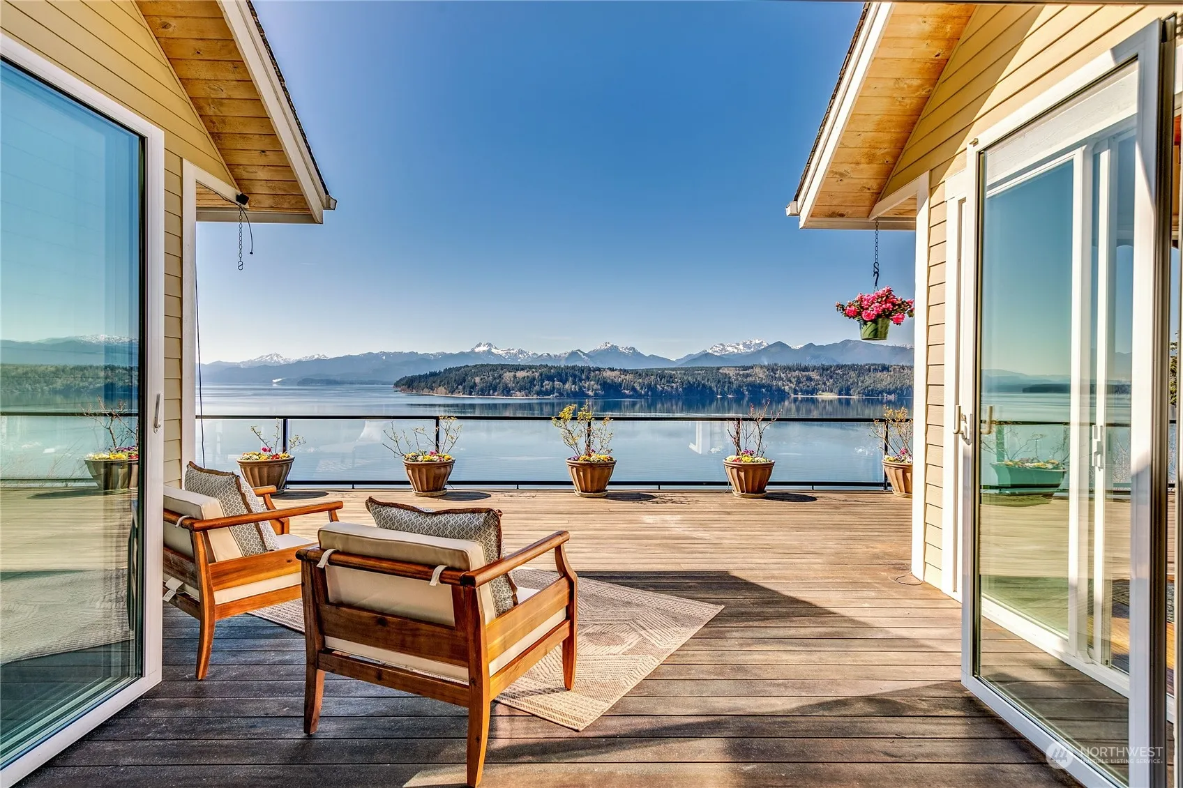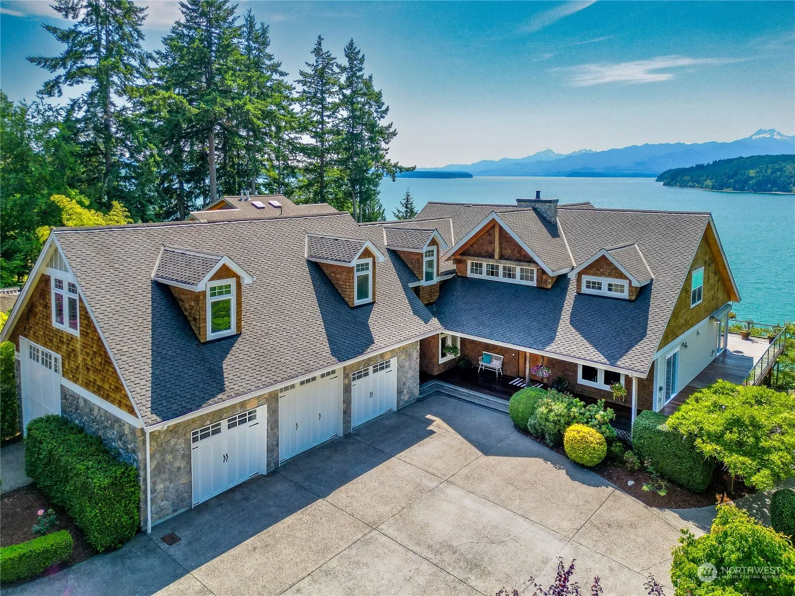 Experience world class Olympic Mountain & Hood Canal views from this luxurious 1.03 acre waterfront estate! Meticulously crafted 6066sf Main Residence offers 5 bedrooms & 5 baths. A detached 1192sf fully equipped guest house/ADU provides flexibility for hosting or multigen living. The stunning great room features a magnificent 26′ Eldorado stone fireplace, timber frame detail, & walls of windows. Double sets of NanaWall glass doors for seamless indoor/outdoor living onto the expansive tiger wood deck. Beach access provides maximum enjoyment & abundant oysters! Immense 3 car garage + 13′ RV bay. The epitome of waterfront living combining convenience & tranquility, your peaceful retreat off a country lane yet moments to Silverdale amenities!