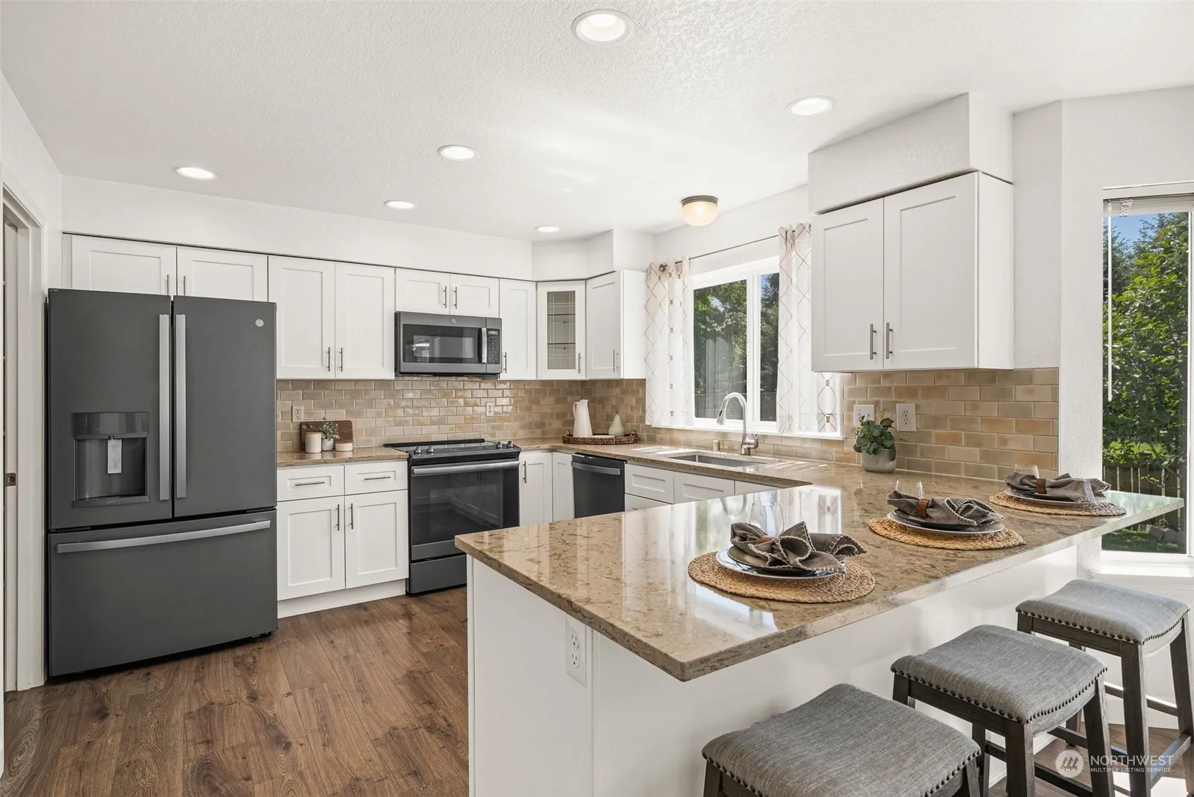 This four-bedroom home lives like new with its beautifully remodeled kitchen which features custom cabinets and countertops, tile backsplash, seating bar and stainless-steel appliances. You’ll enjoy all the natural light through the large wall of windows. Nicely size formal dining room. Main level primary suite with a large 5-piece bath. The upper-level play loft area is outside the additional three bedrooms. A fully fenced yard backs to a green belt, allows for year-round privacy. A newer roof, newer heat pump, furnace, and exterior paint.