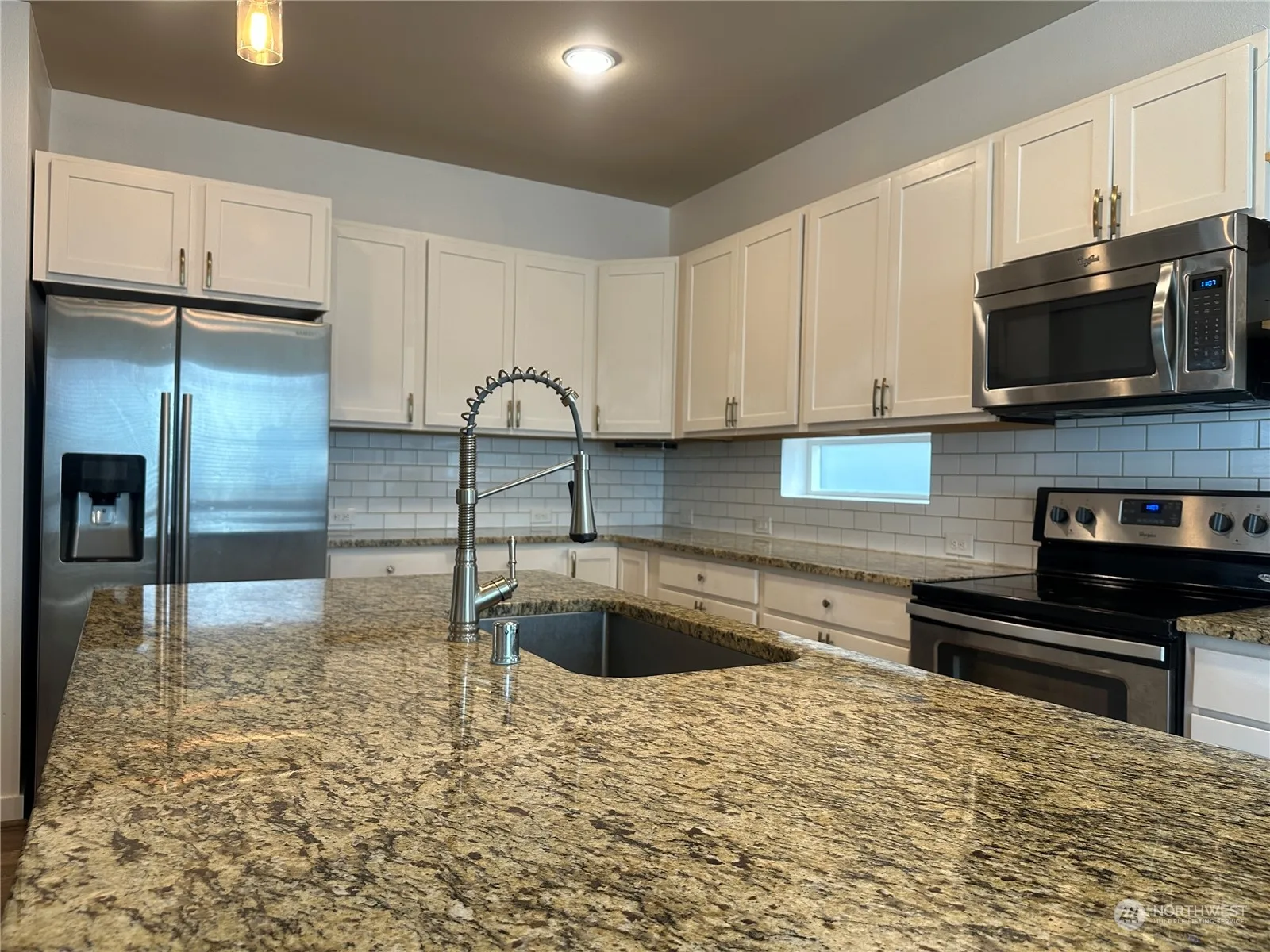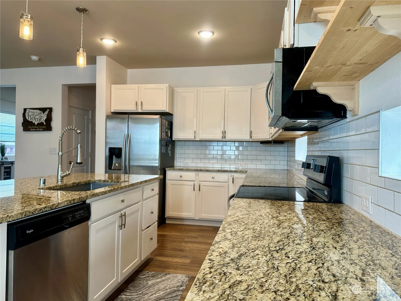 4 Bedrooms + MAIN FLOOR office/den (or 5th bedroom). Kitchen boasts a HUGE granite island and subway tile backspace with white cabinetry. Stainless steel appliances and washer/dryer stay! Beautiful white millwork, luxury vinyl plank flooring, vaulted ceilings and big windows throughout the main floor. Completely updated primary suite bathroom complete with step-in shower and custom tile. Front and backyard has turf- no need for a lawnmower! Complete with a dog run! Backyard has covered patio with extended sitting area perfect for entertaining. Great schools, easy commute to JBLM and I5.