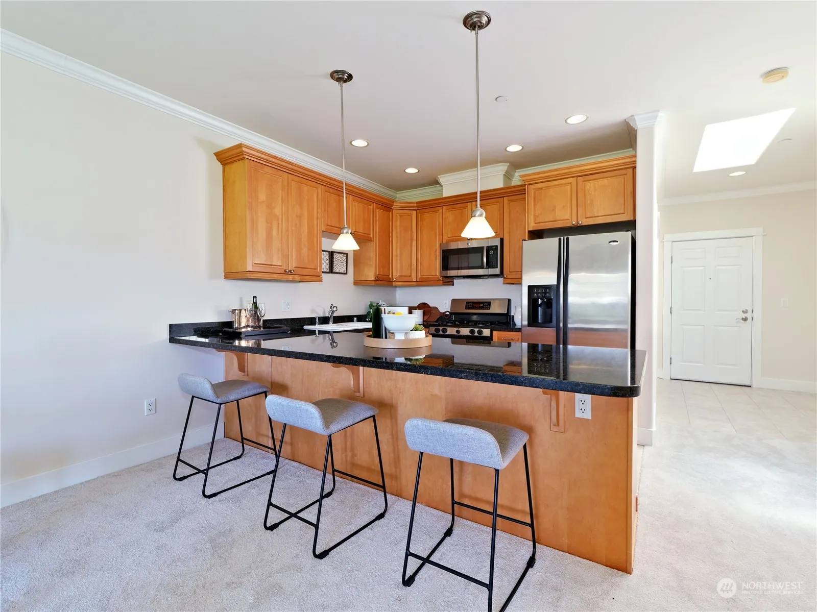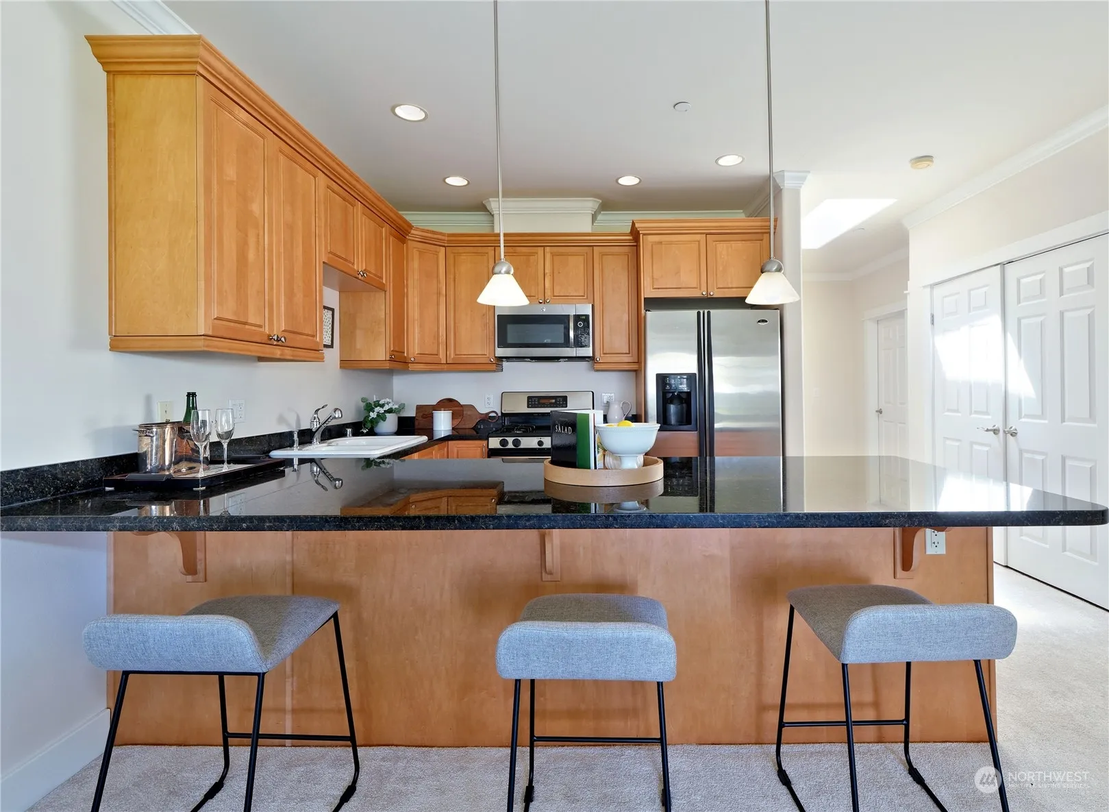 Top floor luxury condo at its finest in the heart of Richmond Beach. Tons of natural light w/open concept living, beautiful kitchen, breakfast bar, gas fireplace & private balcony. Enjoy rich touches such as granite countertops, SS app, crown molding, lush carpet/tile thru-out & plentiful storage. Spacious primary & ensuite dual vanity bathroom, skylight, walk-in shower, & cozy radiant heated floors. In unit W/D, 2 parking spots & an additional XL storage unit in a secure garage. Quiet complex, pet friendly & well maintained HOA. Enjoy daily walks at Richmond Beach Salt Water Park with views of the Puget Sound or run over to the popular neighborhood public library down the street & end the evening with dinner in DT Edmonds.