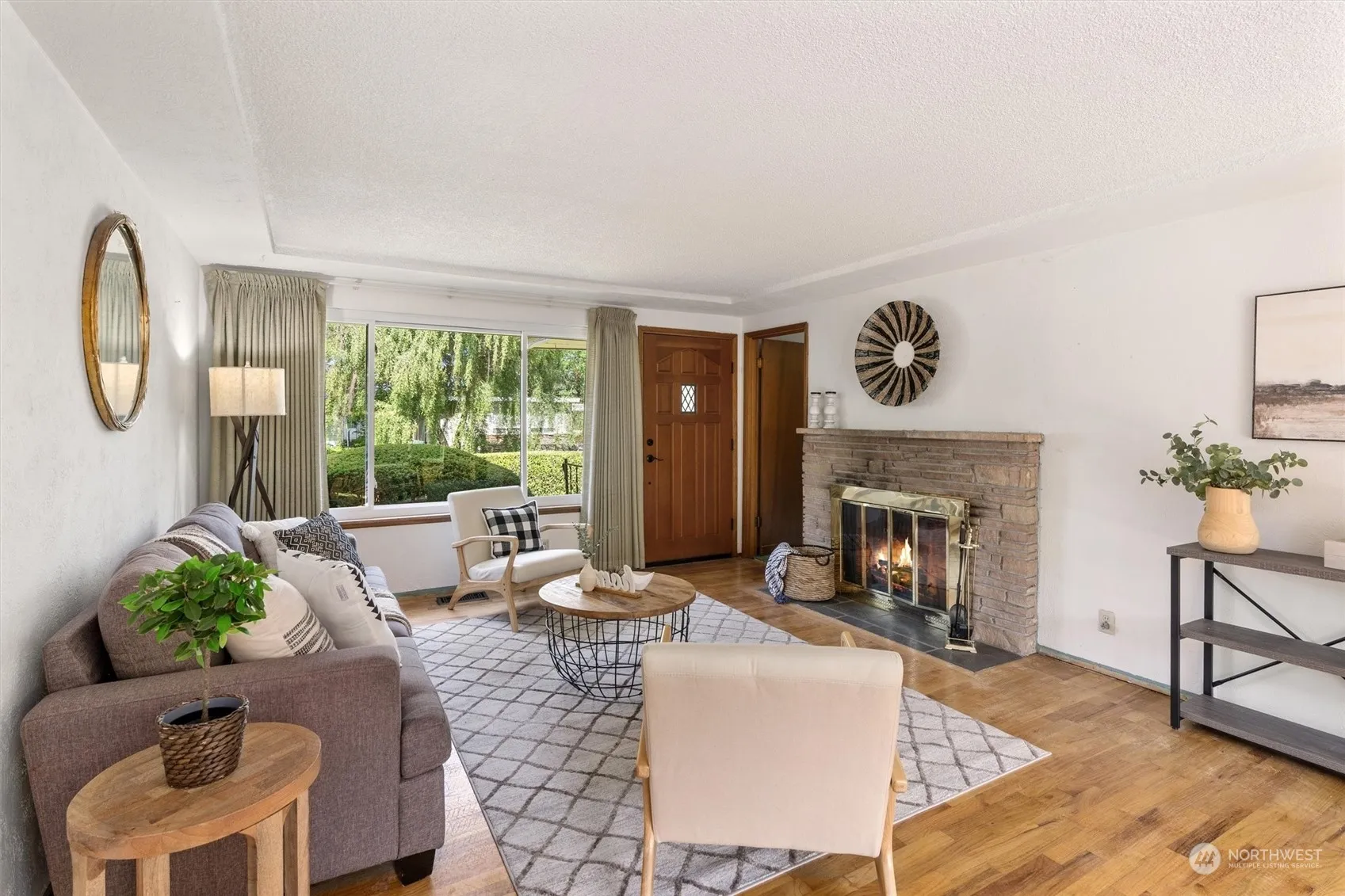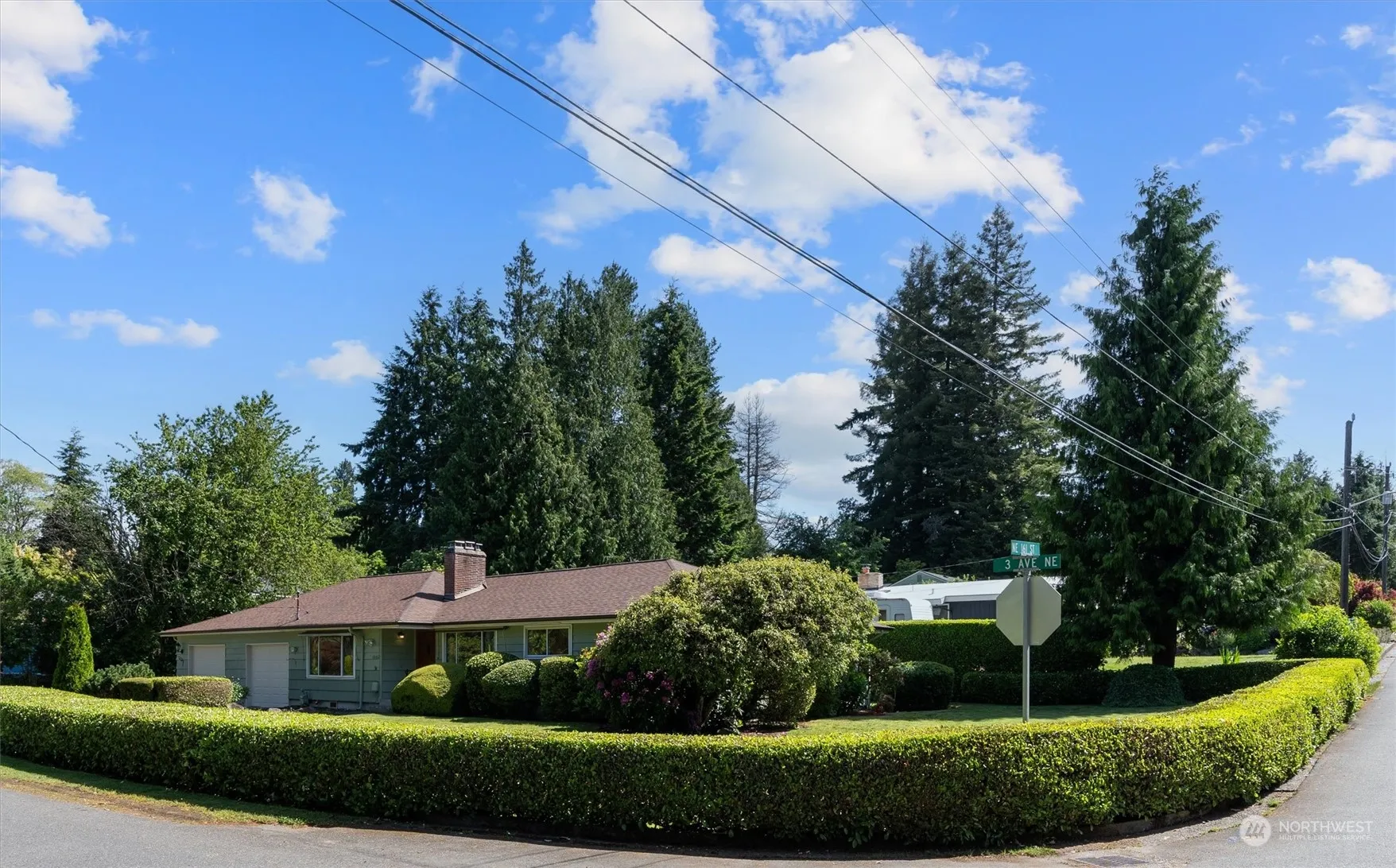 Imagine a charming one-story home with zero steps on a serene corner lot. This fully fenced, private haven awaits your personal touch. Lots of large picture windows bring in natural light to all rooms. Hardwood grace many of the rooms. The expansive living room features a dual wood fireplace (other side is the family room), while the dining room flows seamlessly into a spacious galley kitchen and breakfast nook with a slider to a covered entertainment area. A full-sized 2-car garage offers ample shop space. The beautifully landscaped yard, with picturesque hedges and a large patio, is perfect for BBQs and gatherings. Ample driveway and off-street parking. Conveniently located on a quiet street with quick access to new Sound Transit Station.