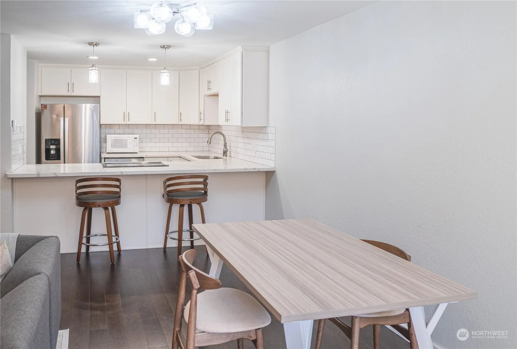 Welcome home to your end unit townhome with modern finishes and completely remodeled kitchen, bathrooms and more. A private backyard let ample sunlight flood the open concept home. Spacious living and dining room with brand new Quarts counter tops and tile backsplash. A chef’s dream with SS appliances, plenty of storage cabinets & eat-in kitchen bar. Convenient and new washer & dryer with plenty of storage. Entertain guests with the private fenced patio for living or gardening. Upstairs includes 2 large bedrooms with walk in closets and fully renovated primary bath. 2 parking spaces, 2 balconies, 1 storage unit and award winning school district makes this one that won’t last!