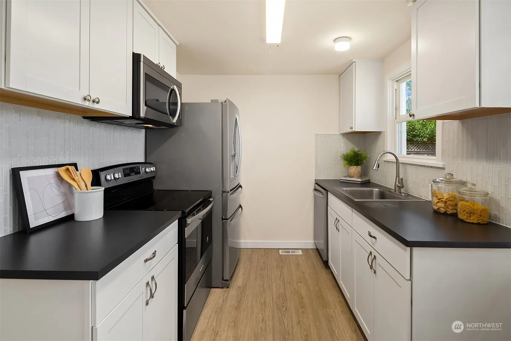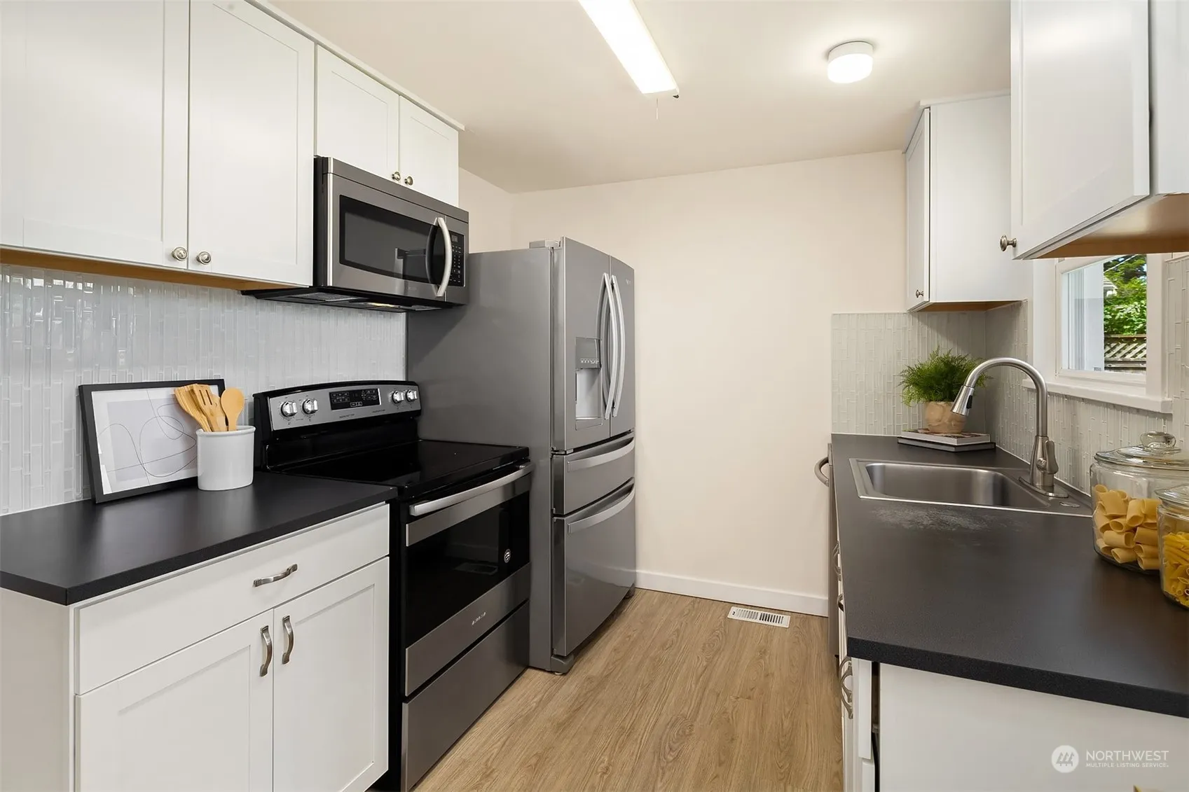 Fully updated Shoreline rambler in prime location of the Ridgecrest neighborhood in sought after school district! Proximity to Paramount Park, Light Rail Station, movie theater and quick access to I-5. Home features 4 large bedrooms and 2.75 renovated bathrooms. The bright main floor features luxury vinyl plank flooring throughout, a dinning room, fireplace, a remodeled kitchen with stainless steel appliances, a pantry for ample storage and eating nook. Enjoy a luxurious primary suite with an attached full bathroom and walk in closet. Designed for comfort and enjoyment, this home boasts a mostly fenced backyard, professionally landscaped with a large shop/shed with power all on a level lot. Interior is freshly painted and new roof in 2024.